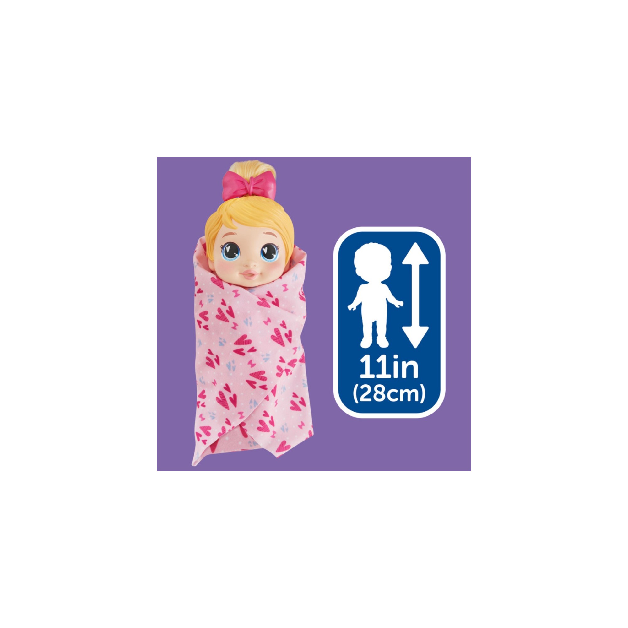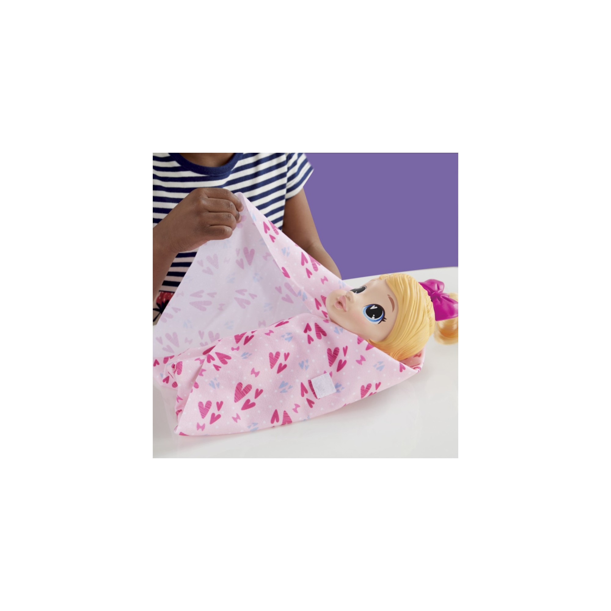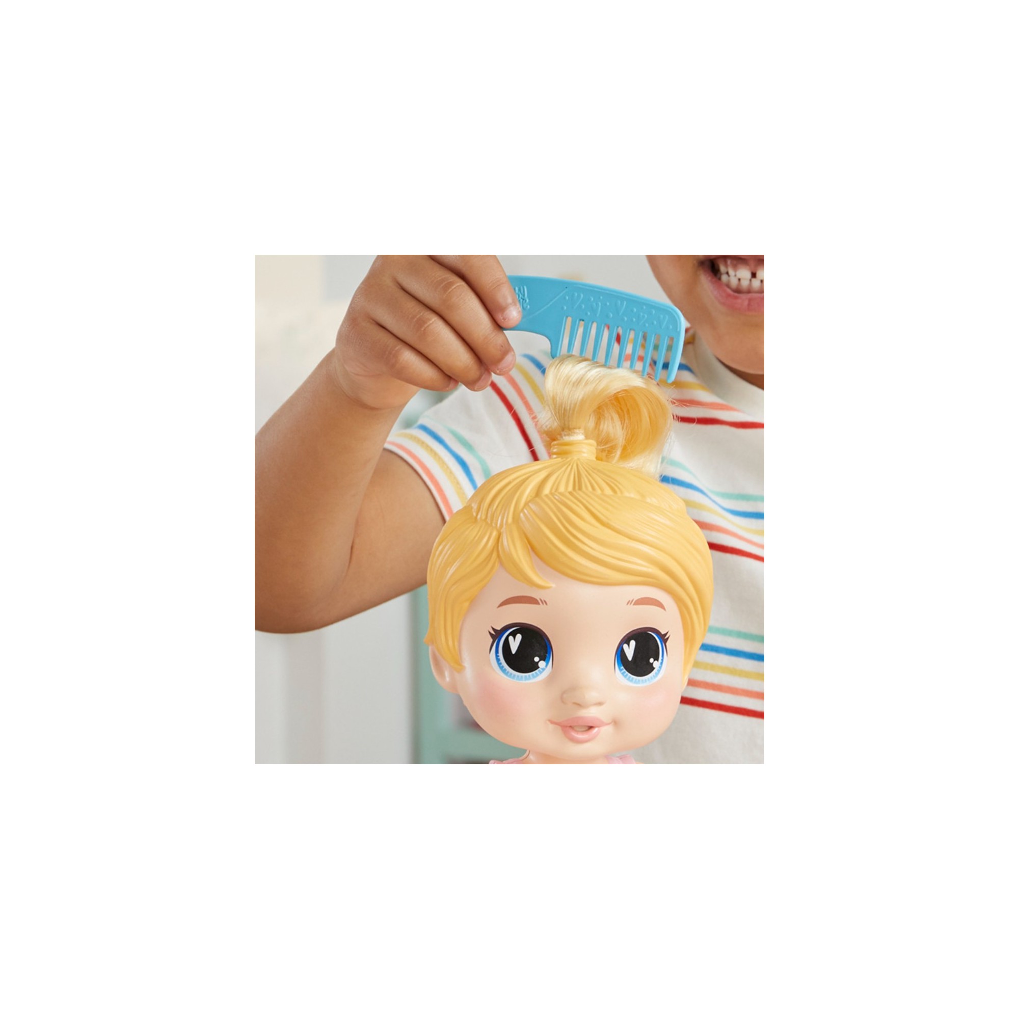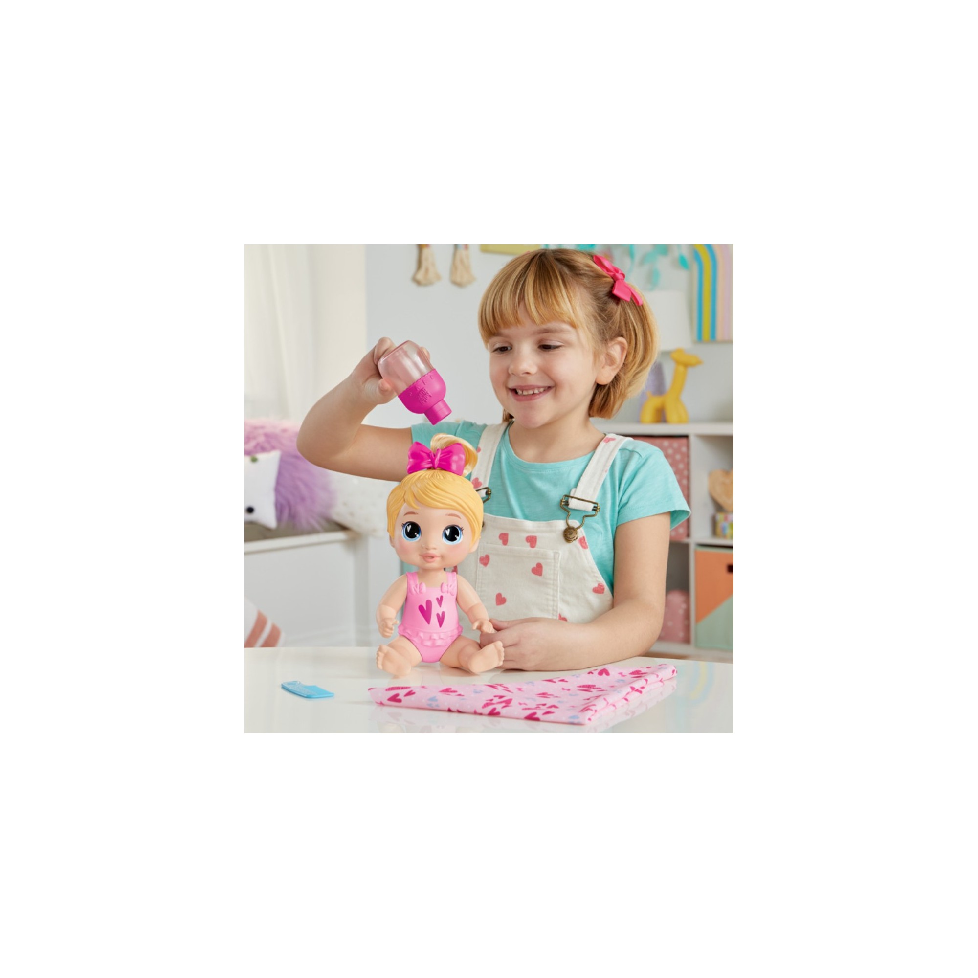 • Wrap her in her towel with fasteners for extra snuggle, then style her hair tuft with the comb and removable bow.