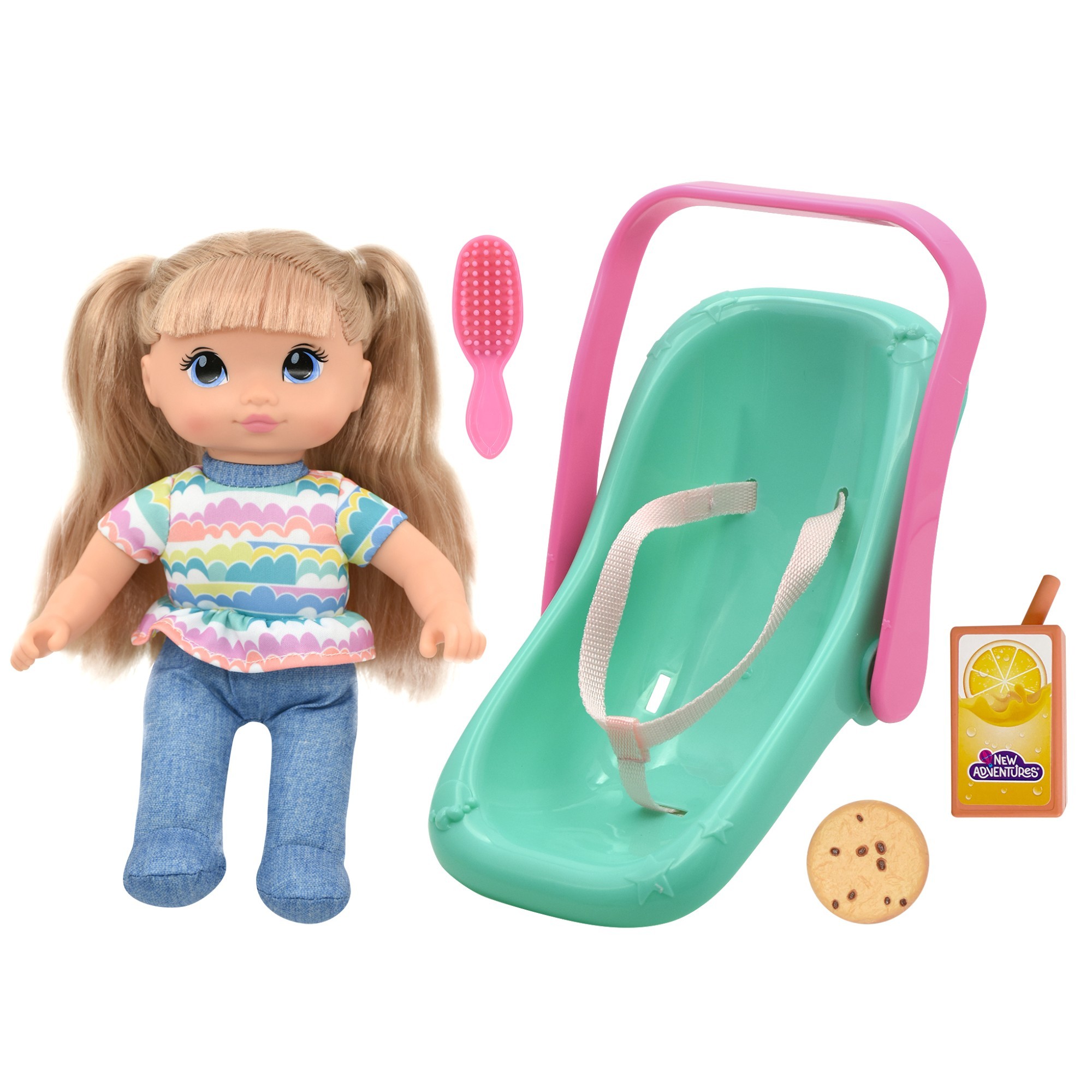10” Little Sweeties doll with car seat. She can go where ever you go and be safe and snug in her seat right next to you. She comes with juice box, cookie and brush. Everything needed for the perfect car ride or trip. Set includes 10” doll, plastic car-seat carrier, comb, juice box, and cookies.