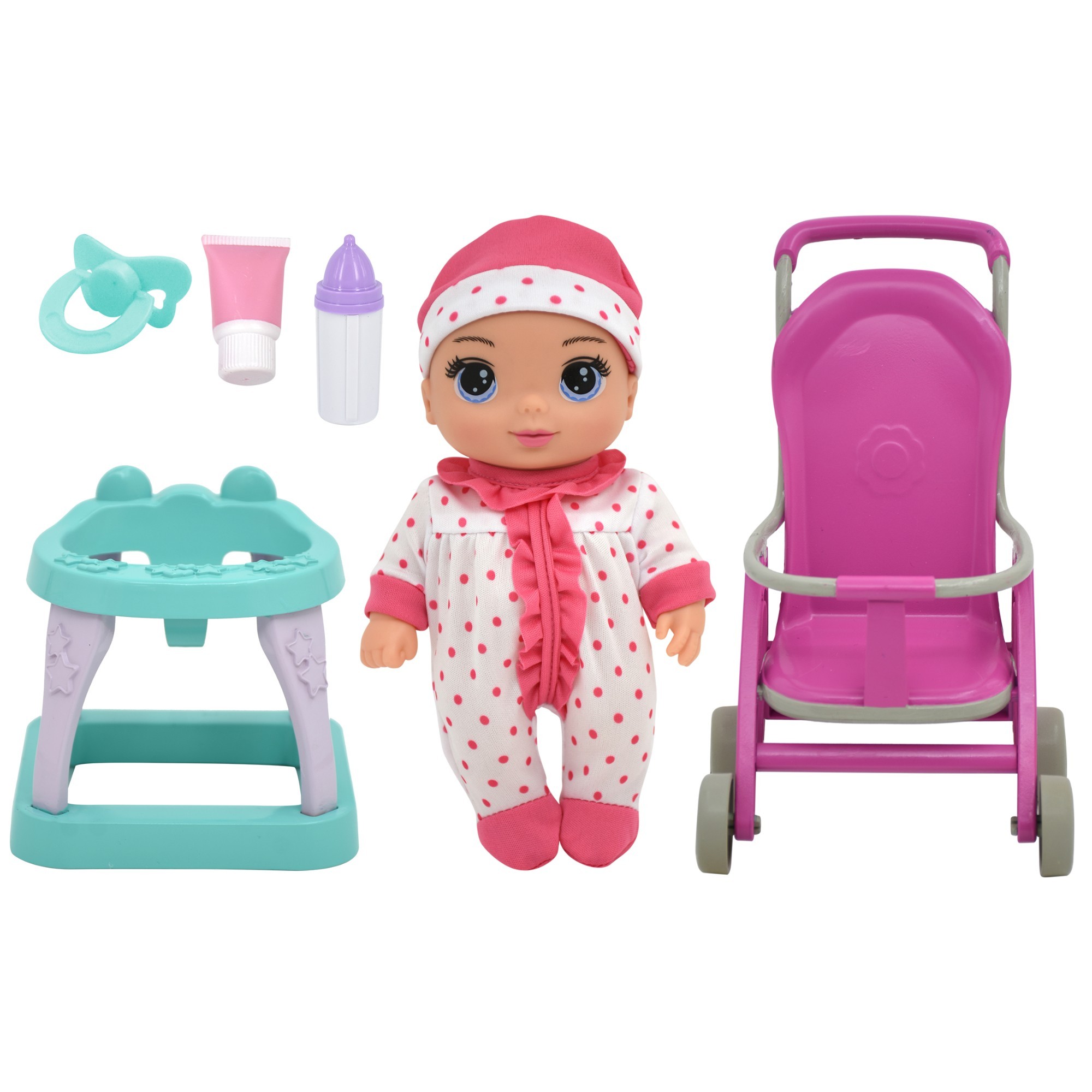 • 8" BABY DOLL: 8" plastic body baby doll with a beautiful bright multi-colored top with a heart pattern, pink pants and matching head band. Play with her in the stroller, walker, or independently.
