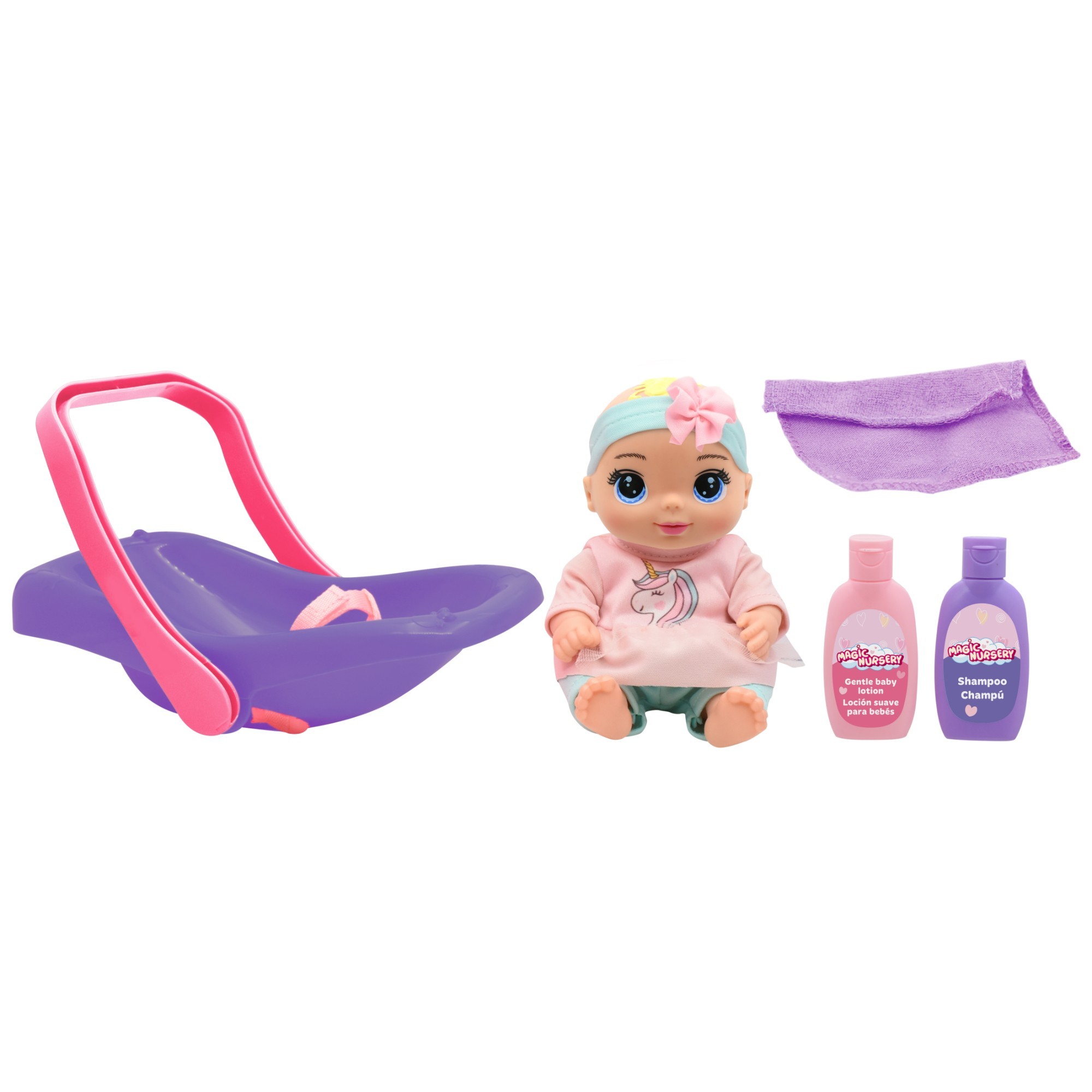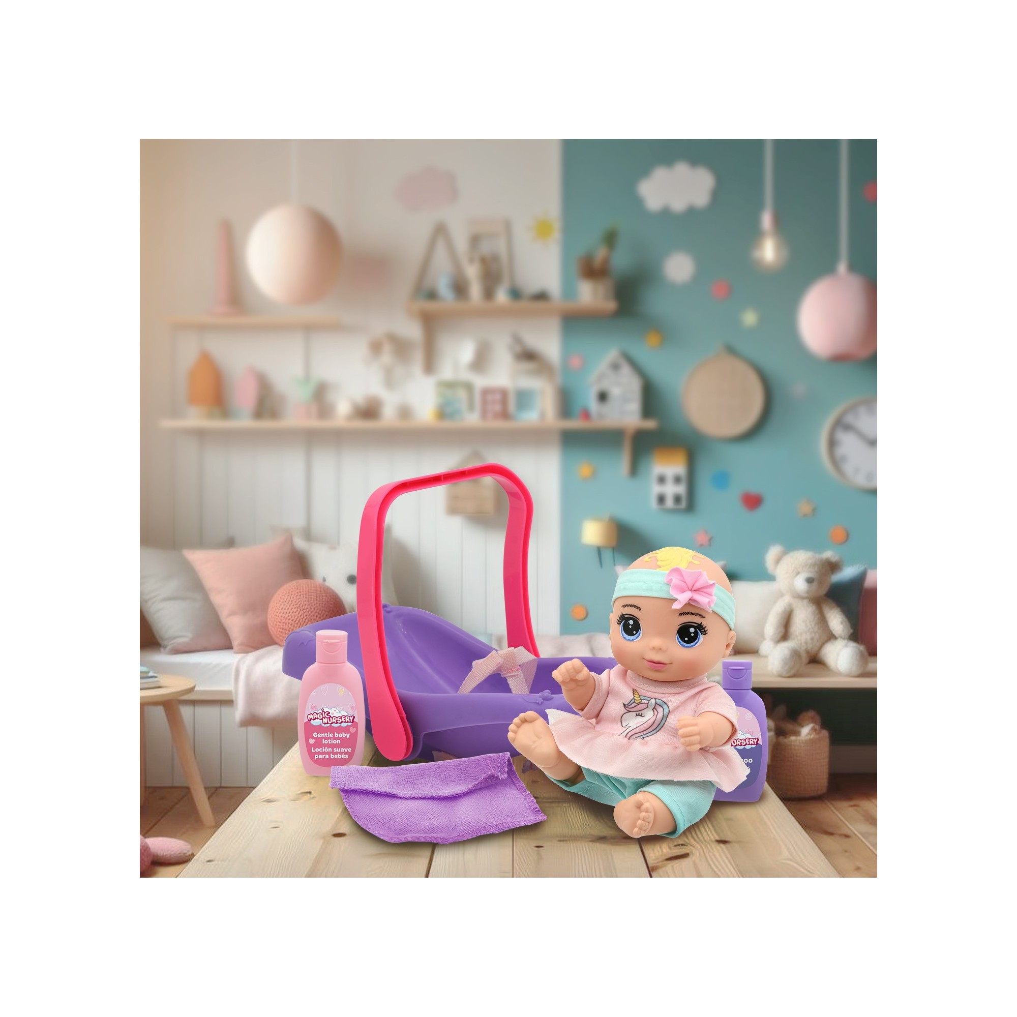 The Magic Nursery Tote Along Baby is a cute and portable 8-inch doll set designed for imaginative play. With a tote-along carrier and nursery accessories included, children can enjoy caring role-play at home or on the go. A lovely companion for fun, nurturing adventures.