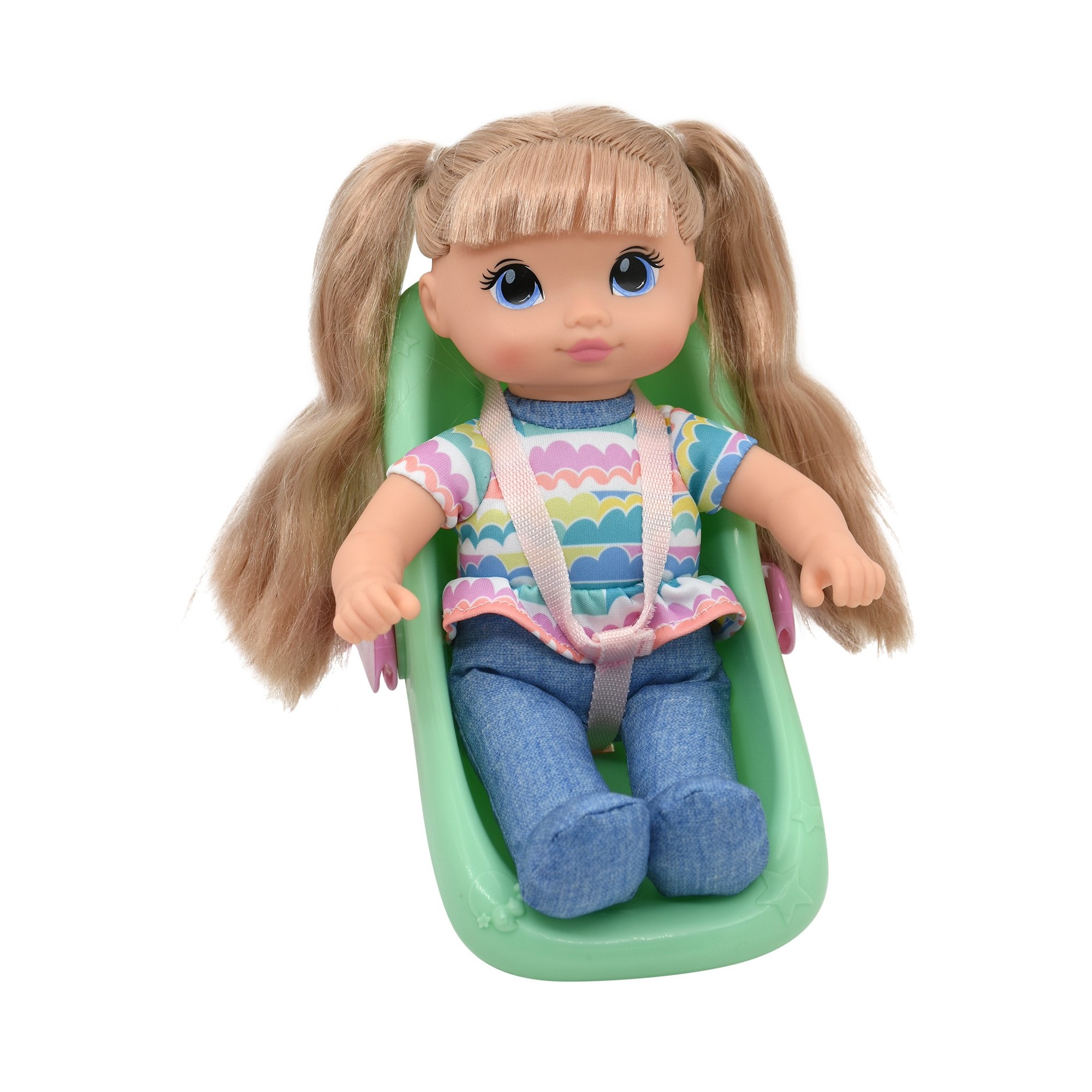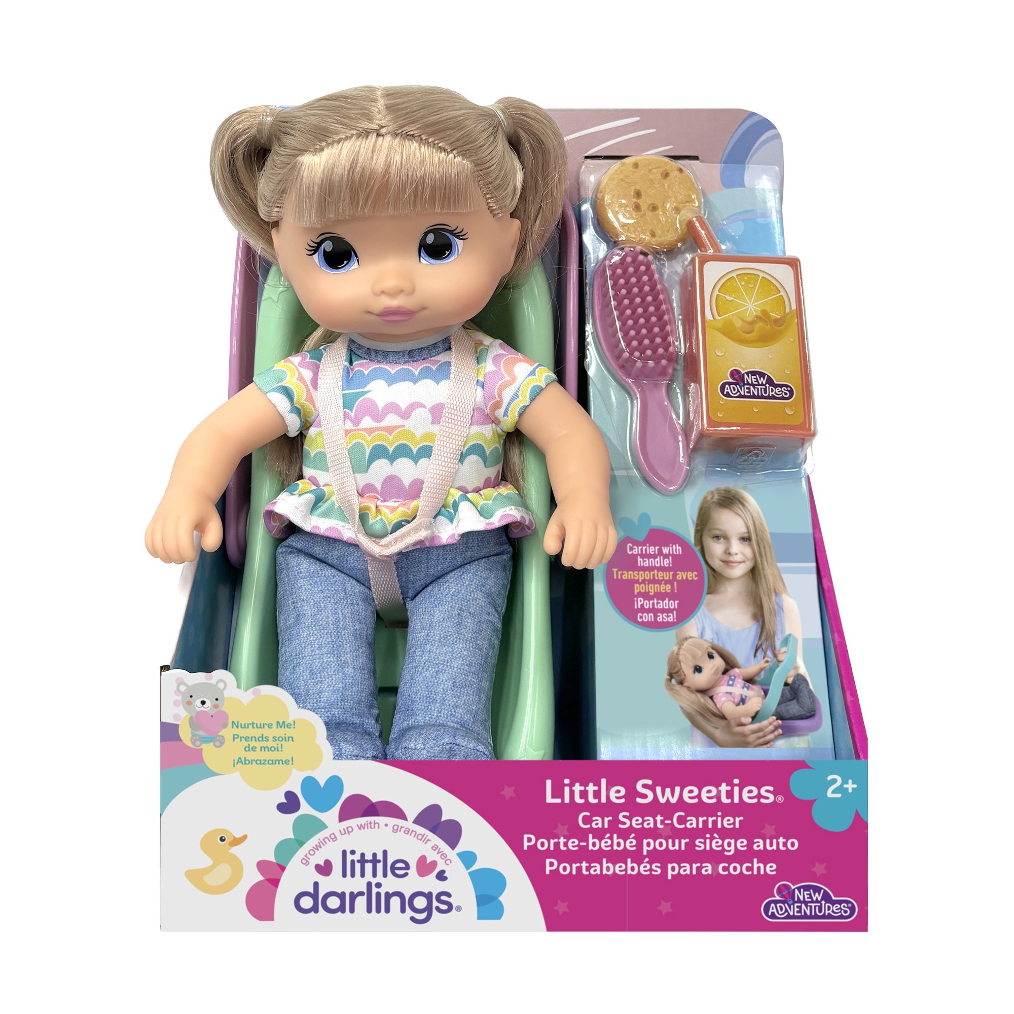 10” Little Sweeties doll with car seat. She can go where ever you go and be safe and snug in her seat right next to you. She comes with juice box, cookie and brush. Everything needed for the perfect car ride or trip. Set includes 10” doll, plastic car-seat carrier, comb, juice box, and cookies.