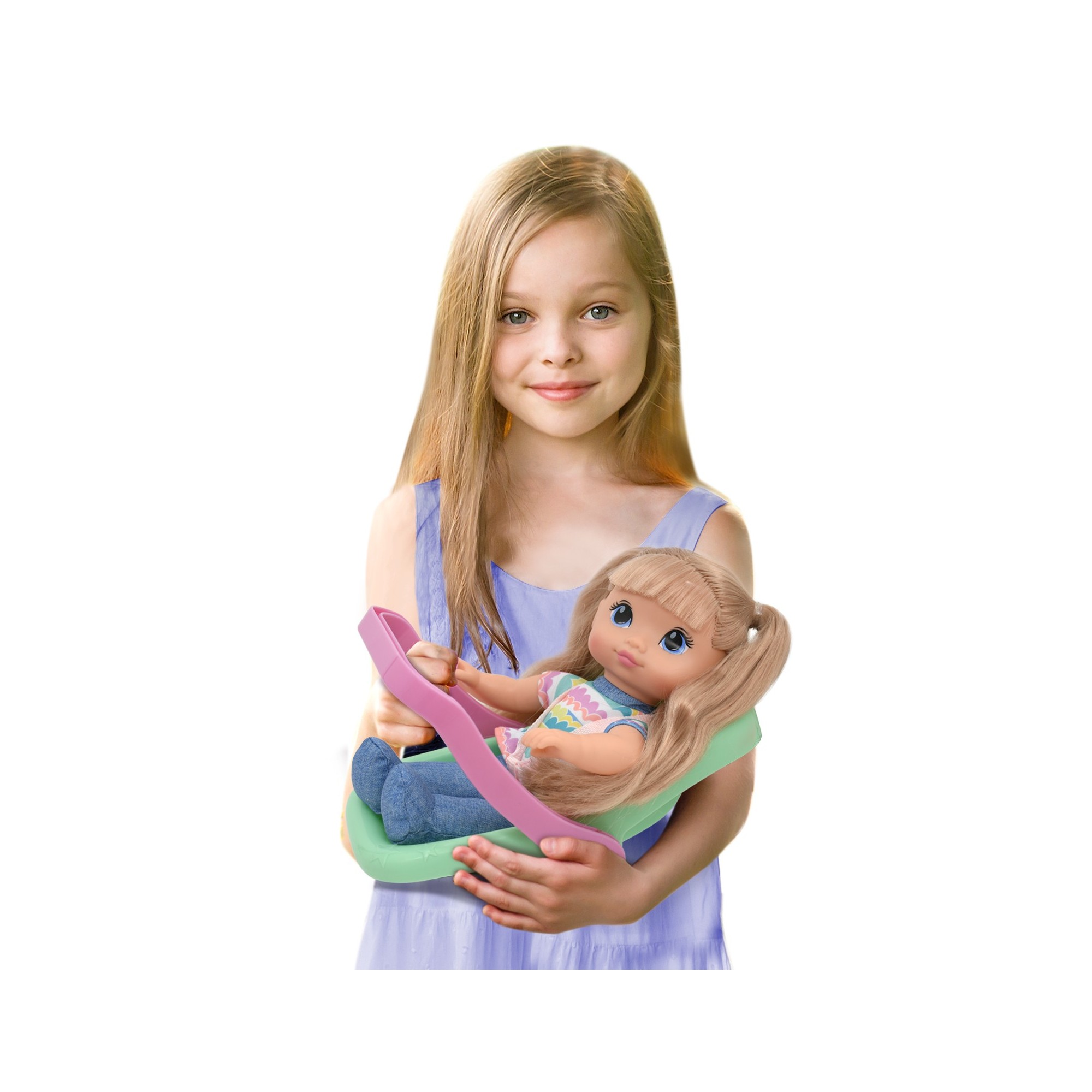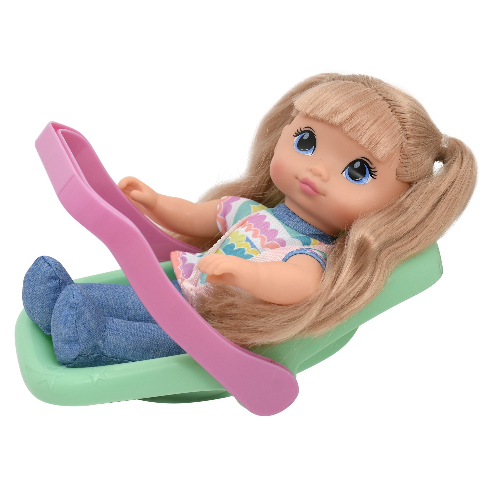 • CAR SEAT: Carry your doll around in style! The pink and teal plastic Car Seat is surface washable. The carrier has a sturdy handle and belt straps to keep baby doll safe and secure.