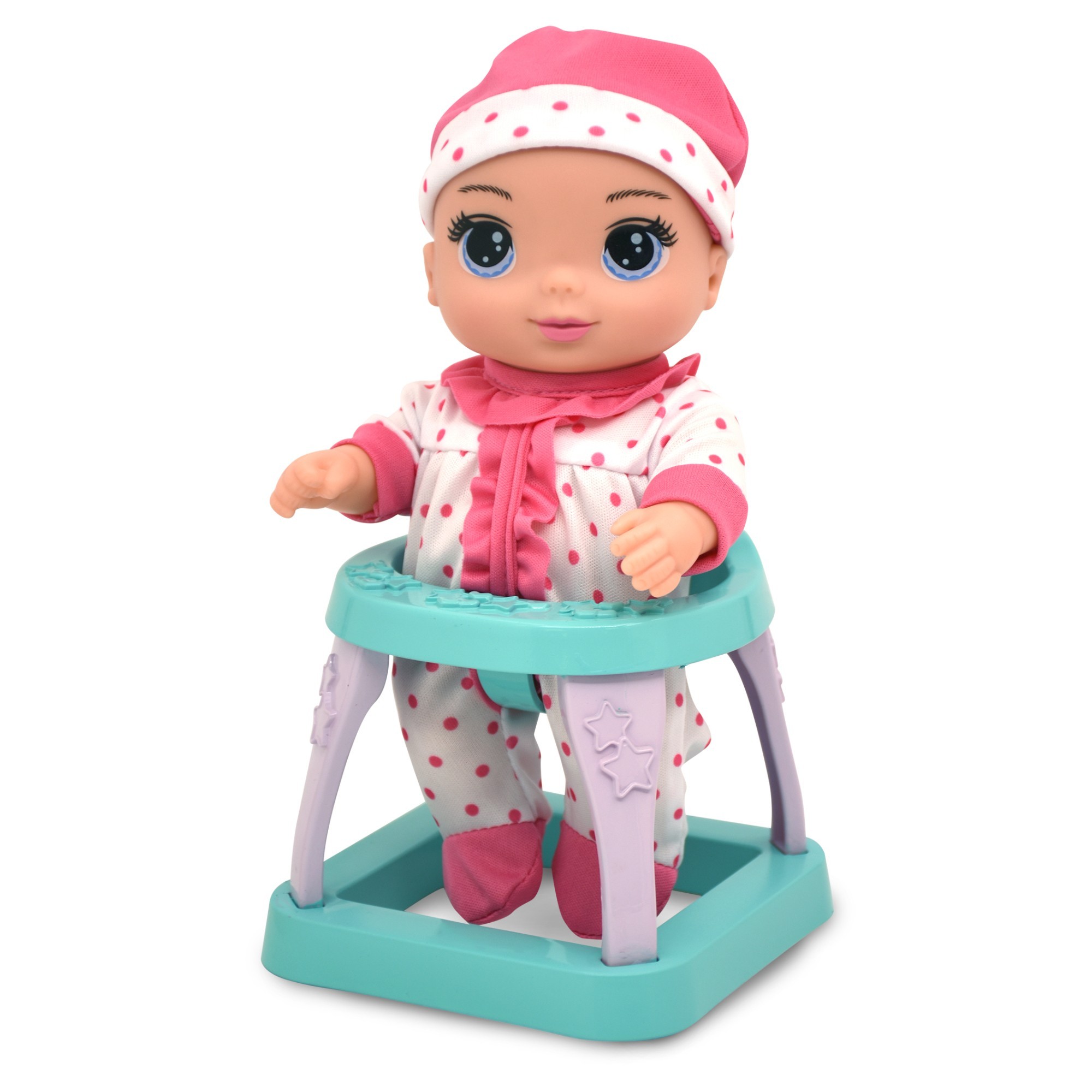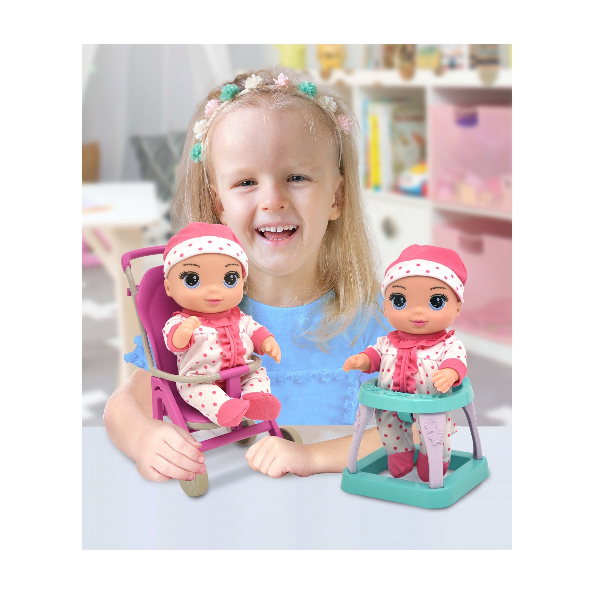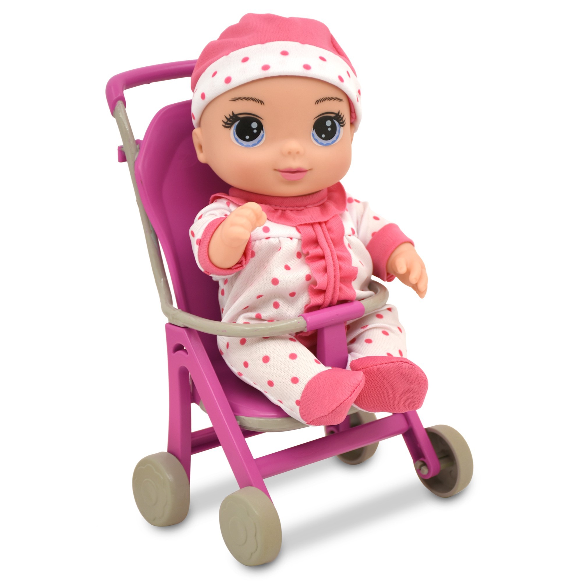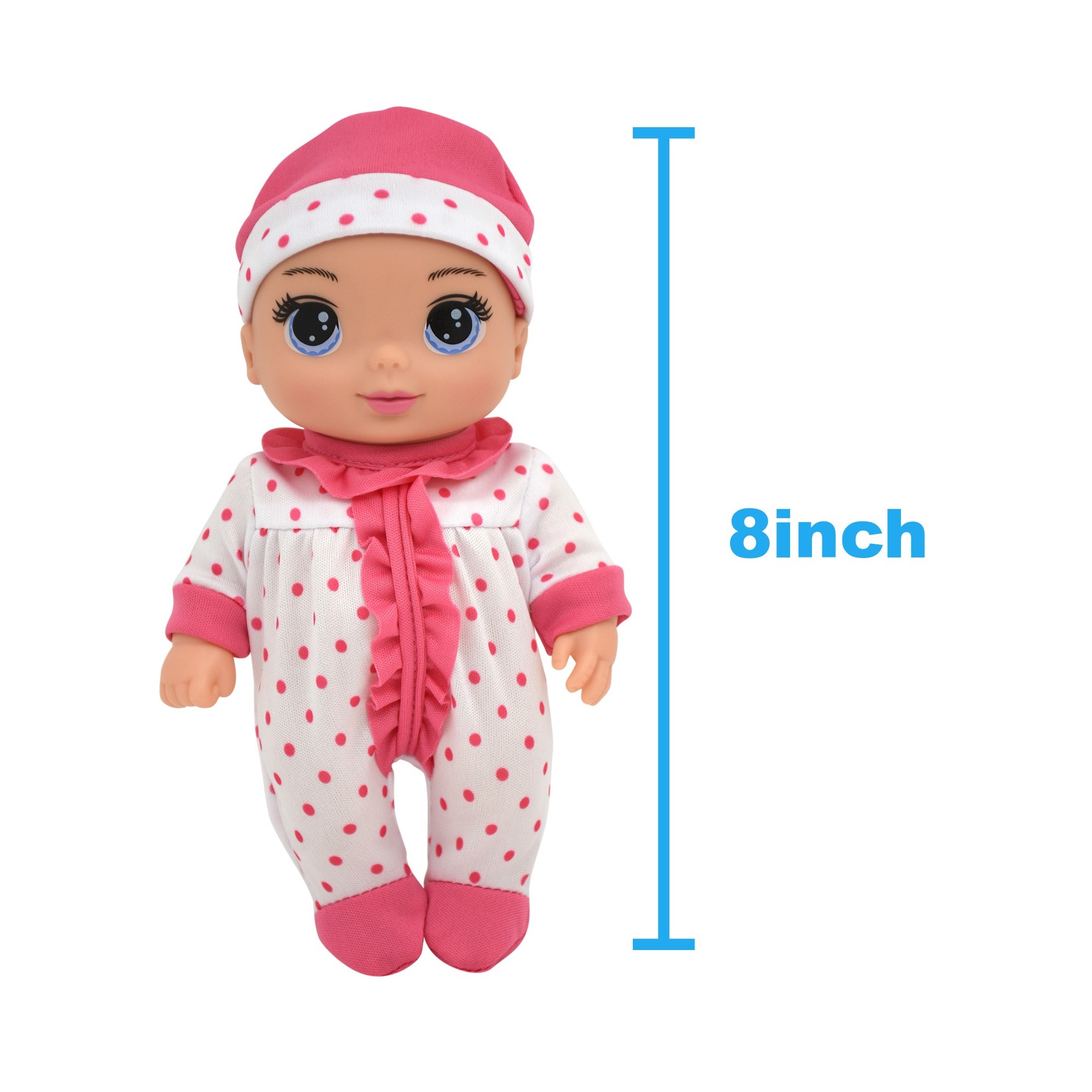 • 8" BABY DOLL: 8" plastic body baby doll with a beautiful bright multi-colored top with a heart pattern, pink pants and matching head band. Play with her in the stroller, walker, or independently.