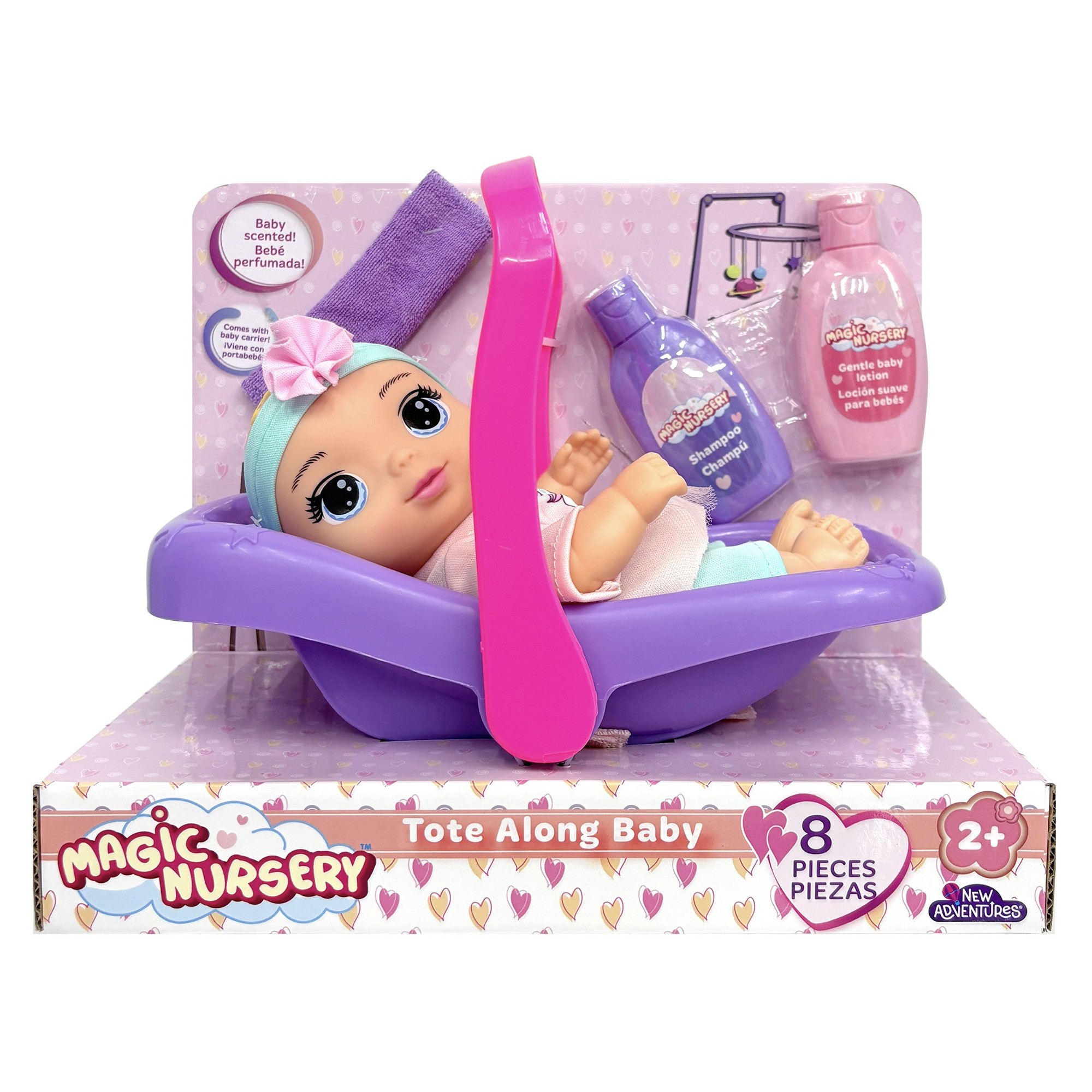 The Magic Nursery Tote Along Baby is a cute and portable 8-inch doll set designed for imaginative play. With a tote-along carrier and nursery accessories included, children can enjoy caring role-play at home or on the go. A lovely companion for fun, nurturing adventures.