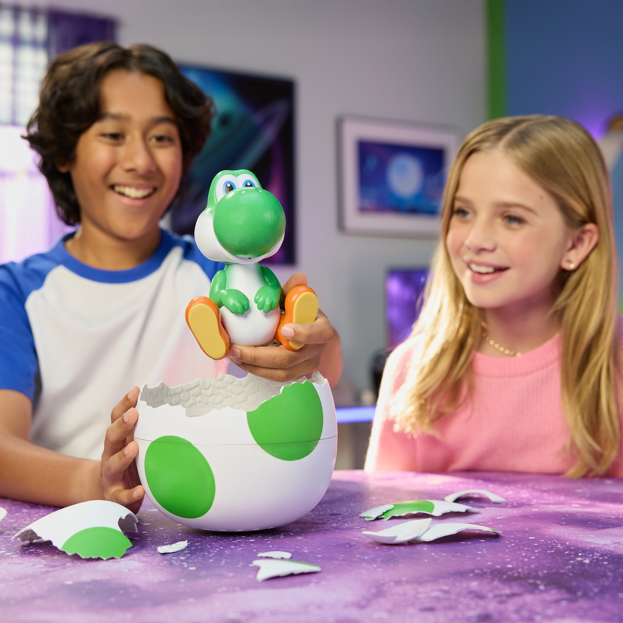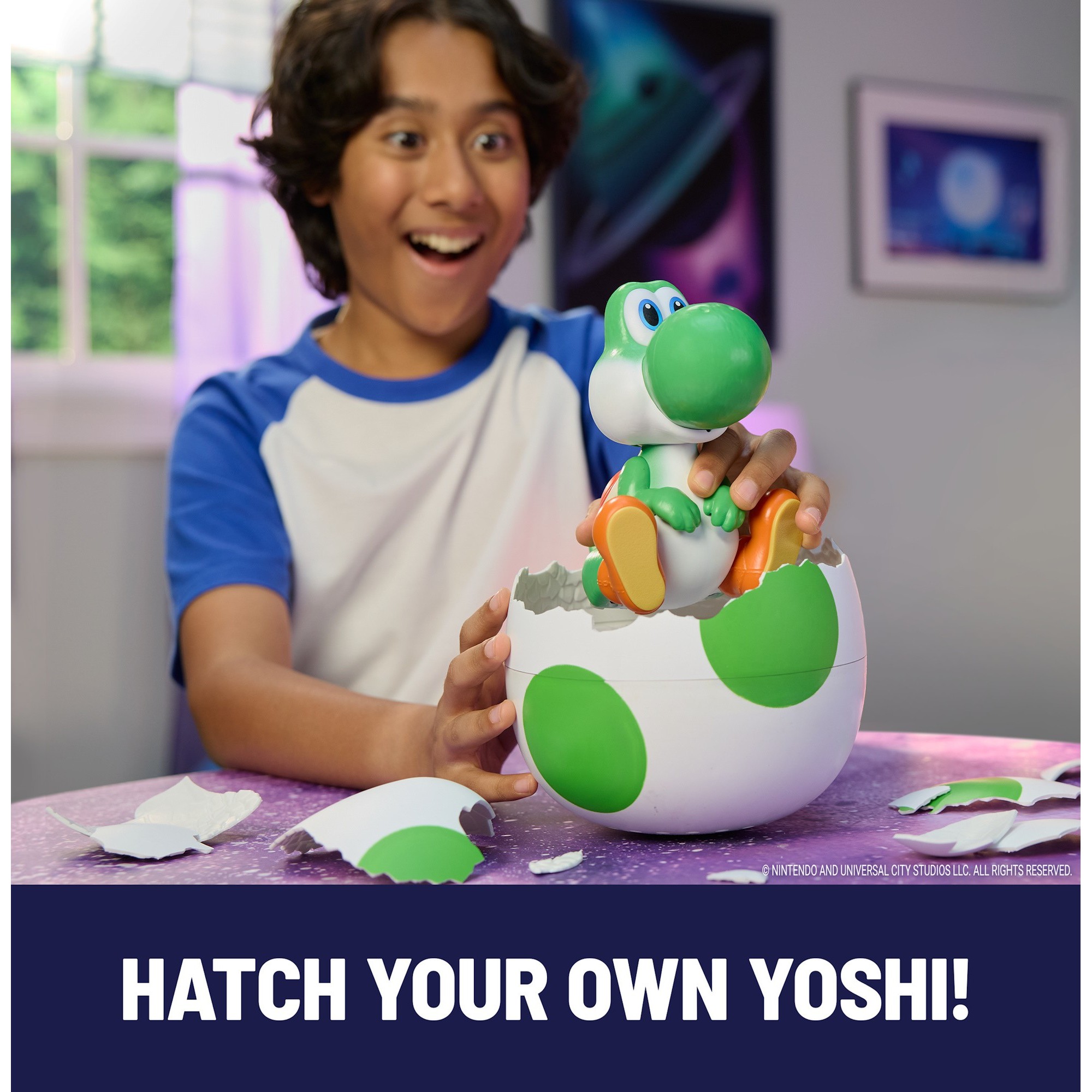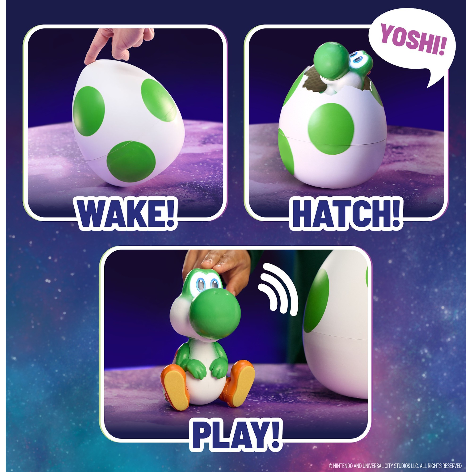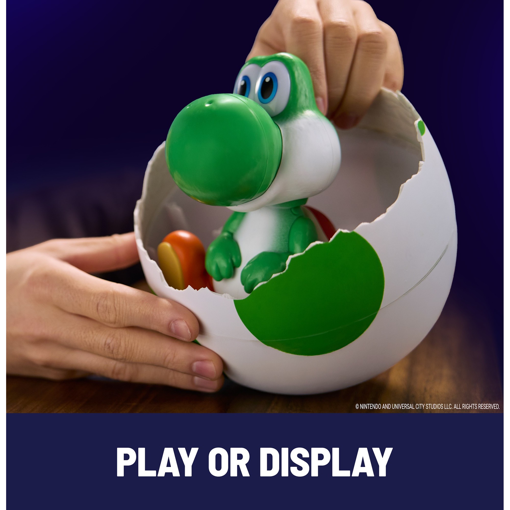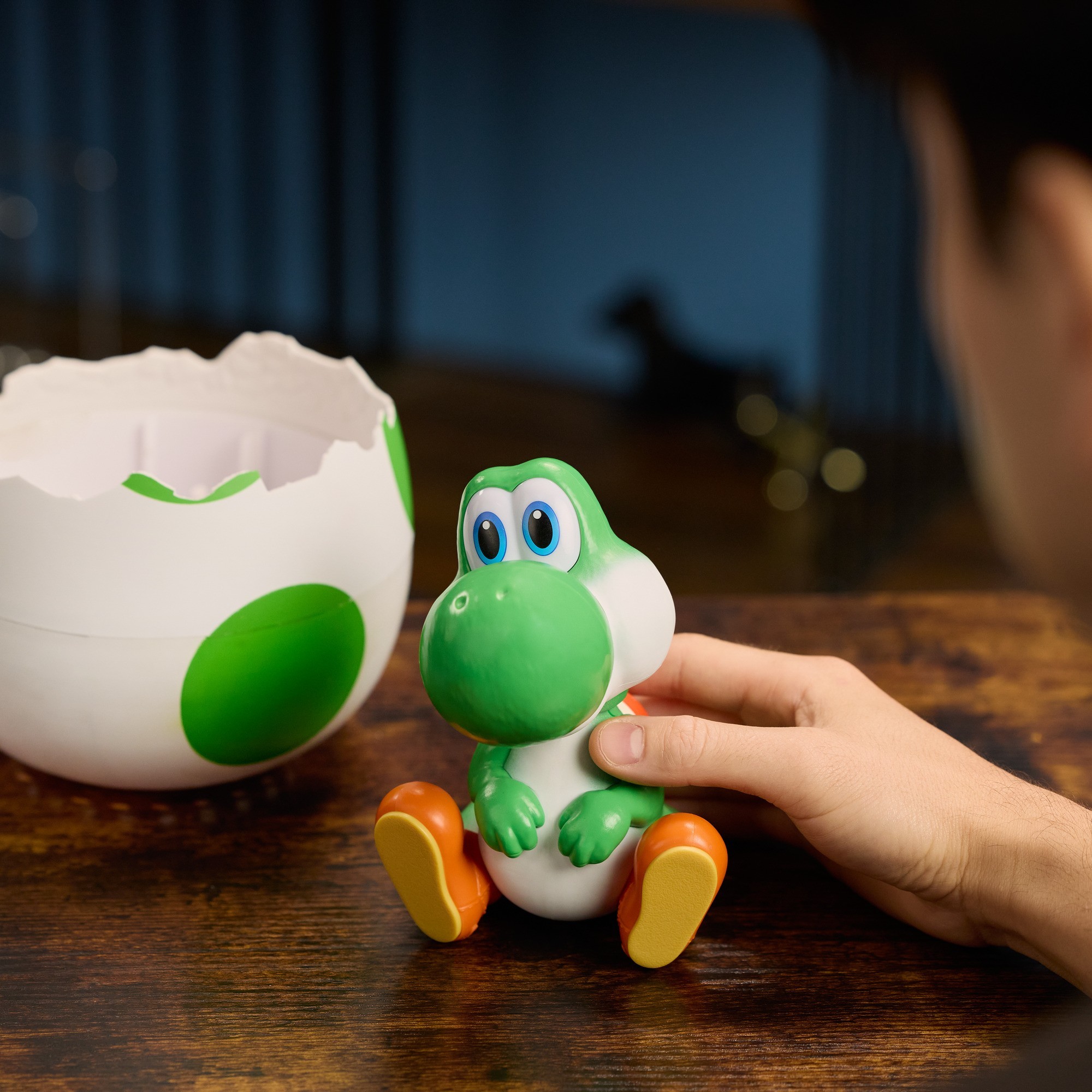 • Hatch Your Own Yoshi: Hatch your very own Yoshi, featured in The Super Mario Galaxy Movie! Start the hatch by interacting with the egg, then watch as it rocks side to side on its own, until Yoshi eventually cracks open and pops out with a “Yoshi!”. Use the bottom half of the egg as a display stand.