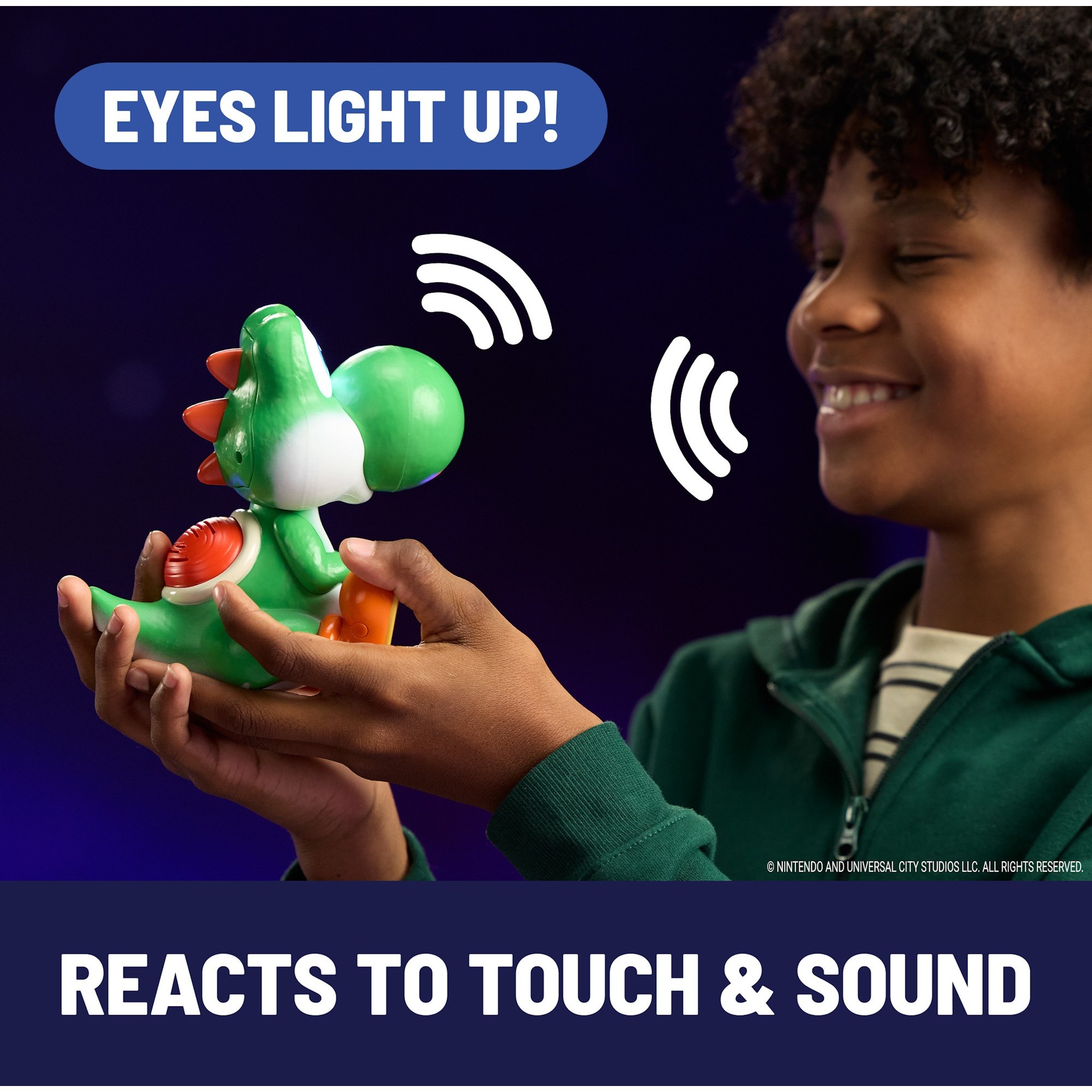 • Light Up Eyes: Yoshi’s eyes will light up when he’s ready to play! Press his shell down and speak to Yoshi to hear him respond, after a while he’ll stop talking and end the conversation with an “aww”!