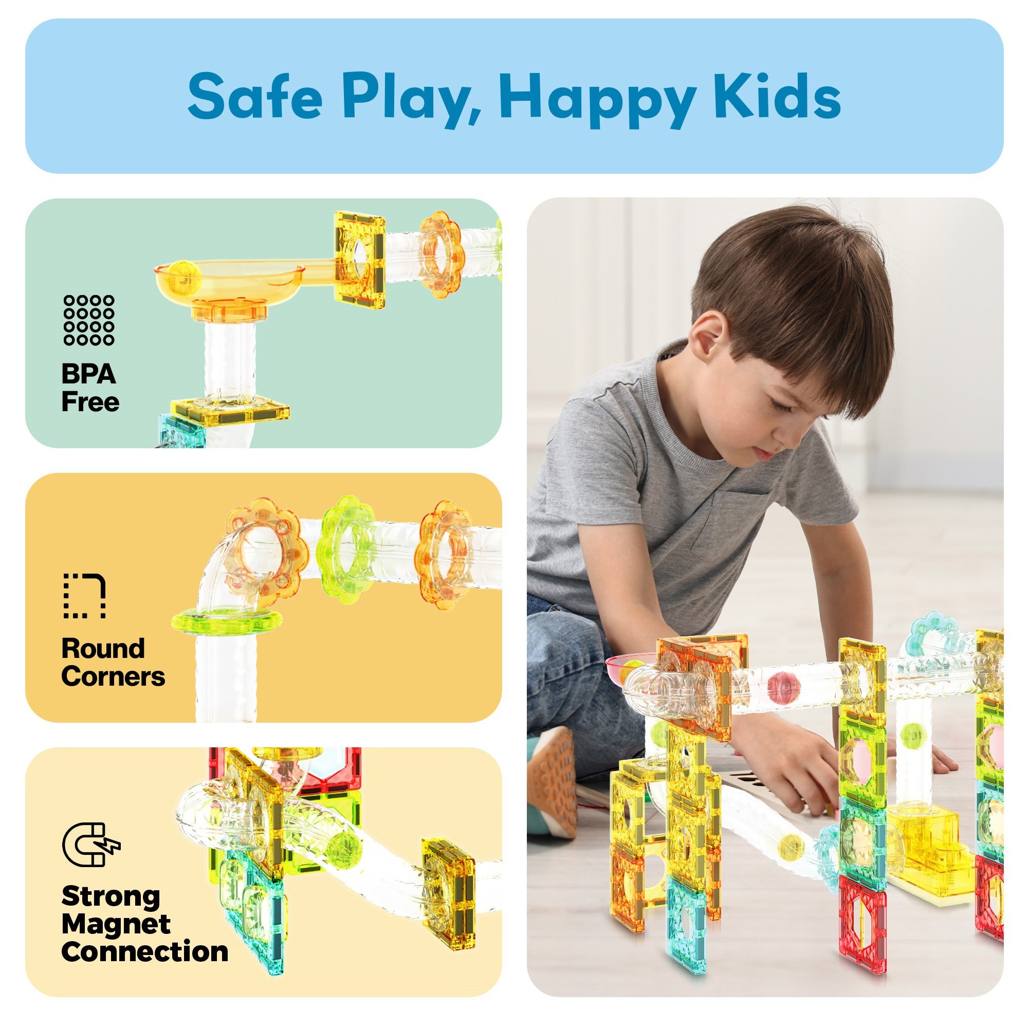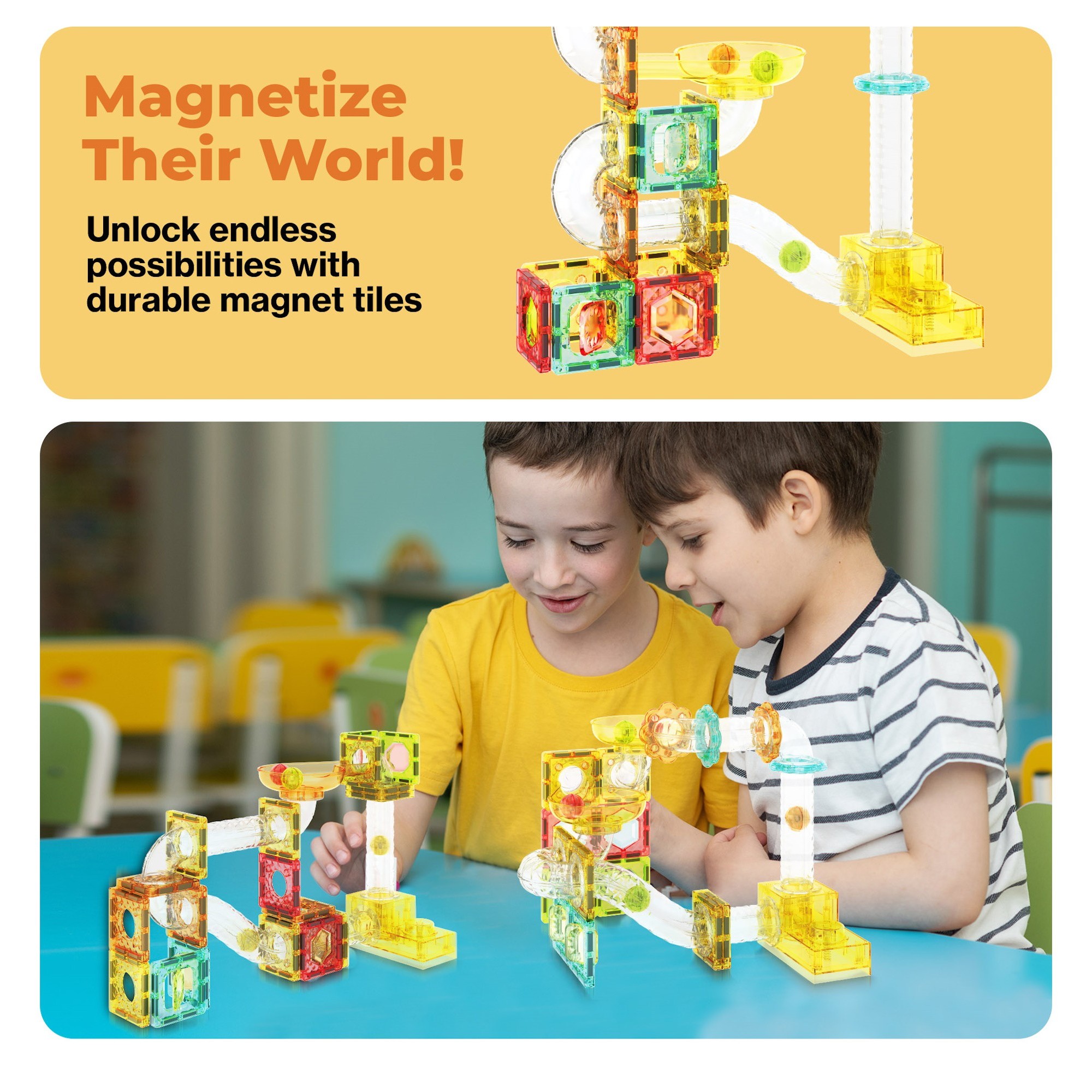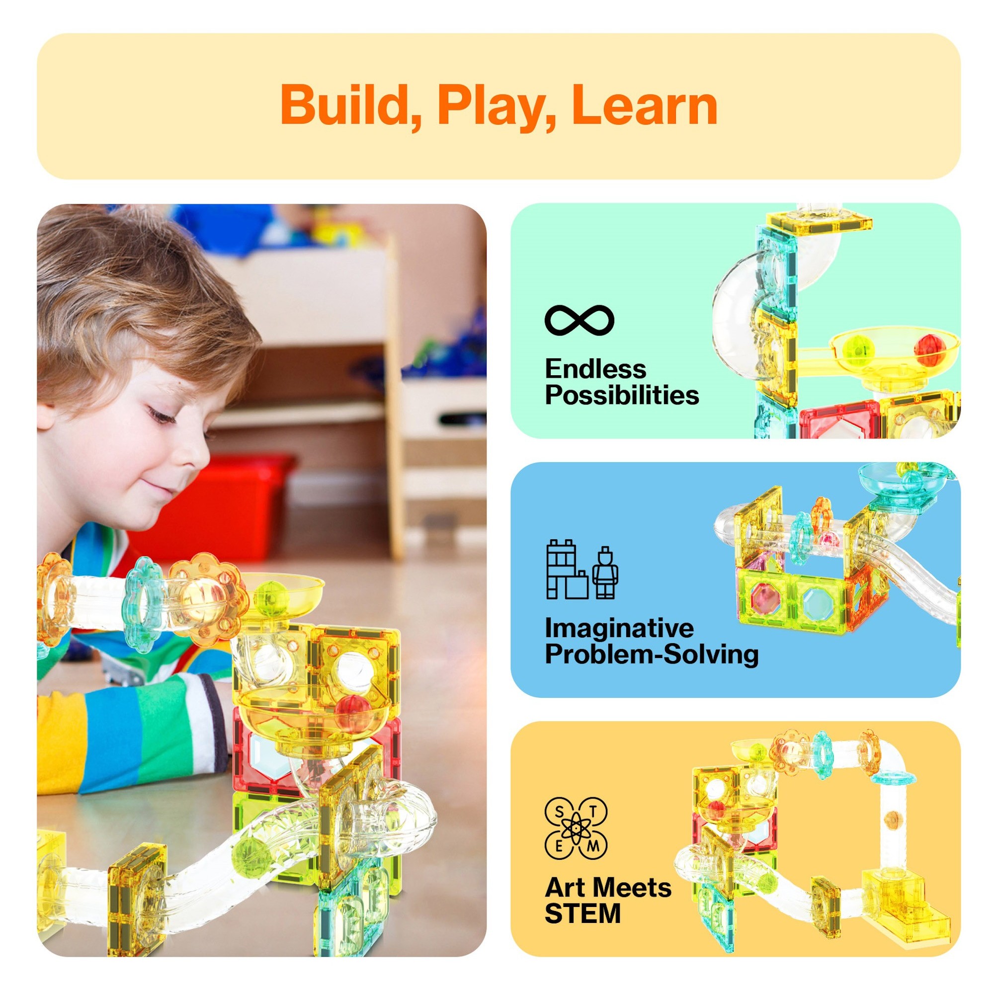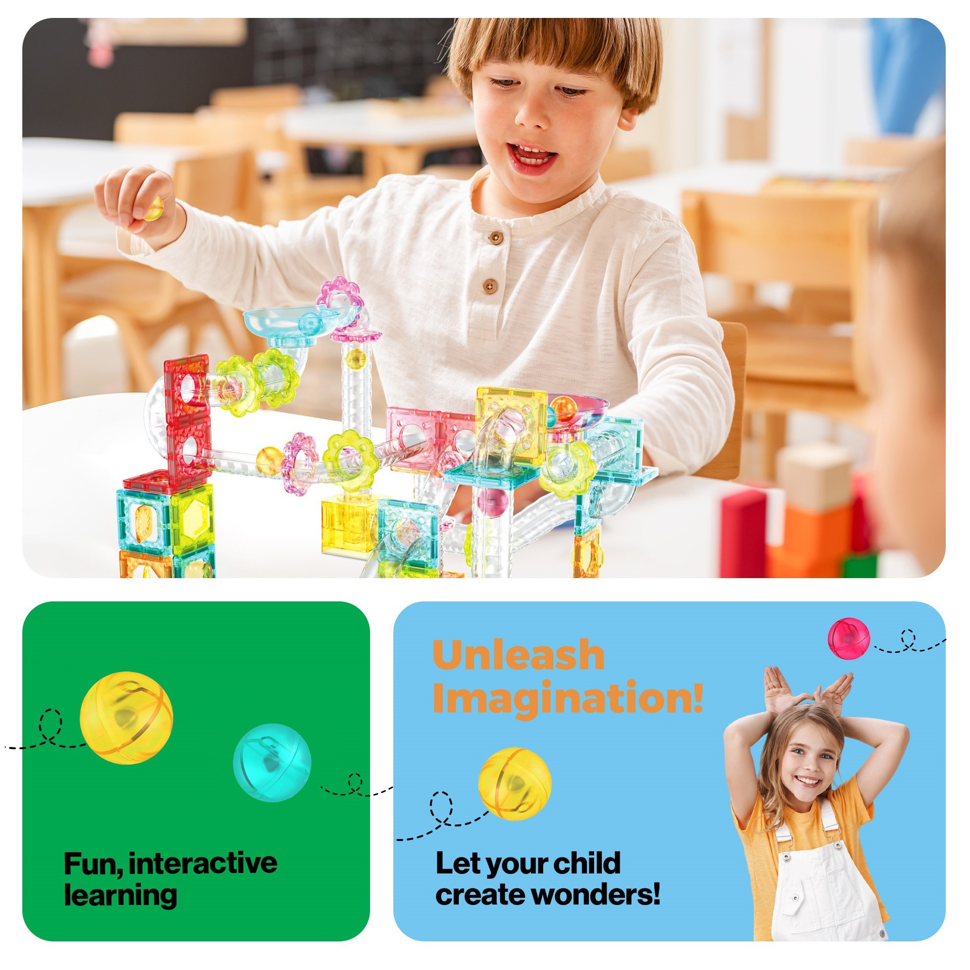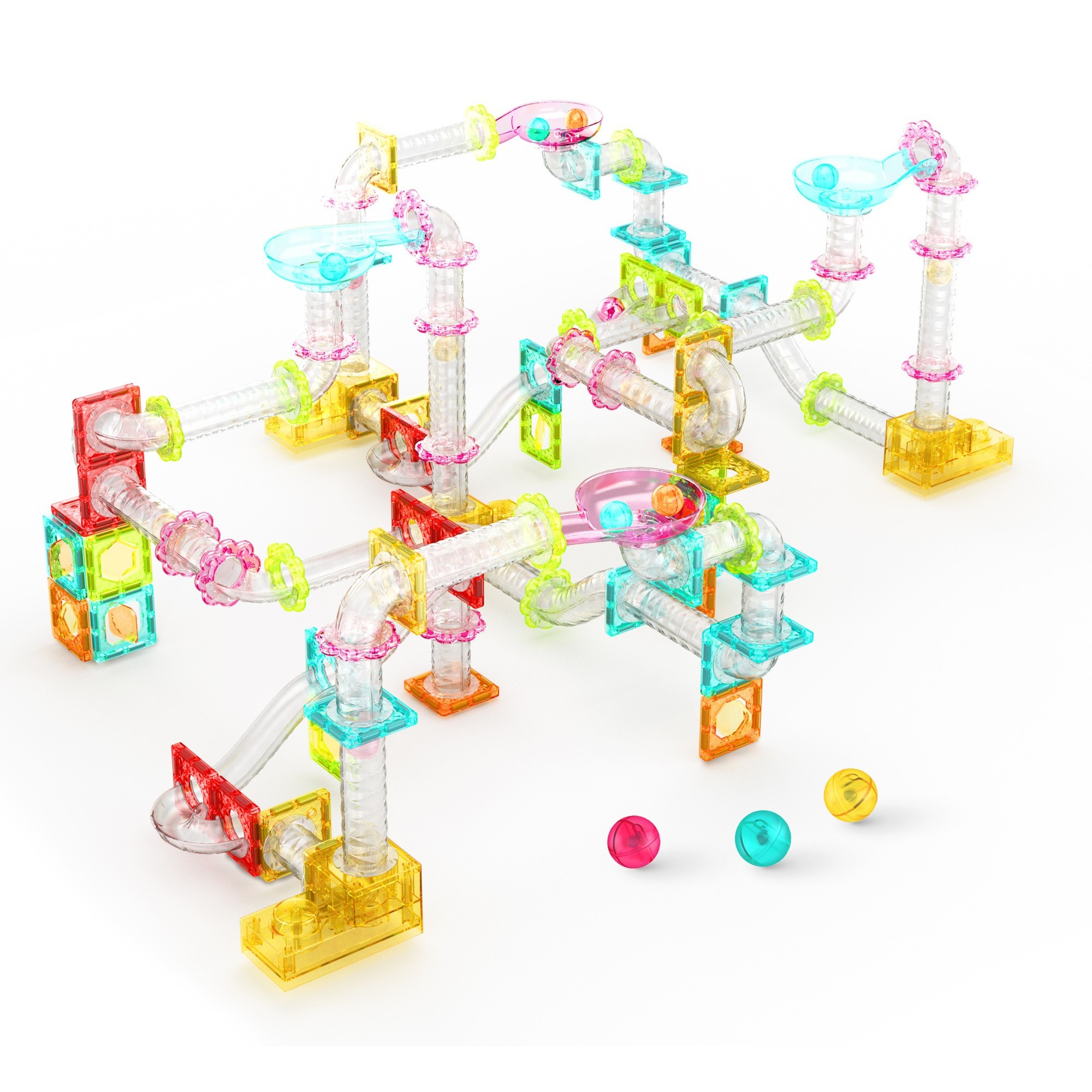 •Includes 100 pieces: mini diamond magnetic tiles, slopes, U-turns, intersections, marbles, and a race marble run launcher.