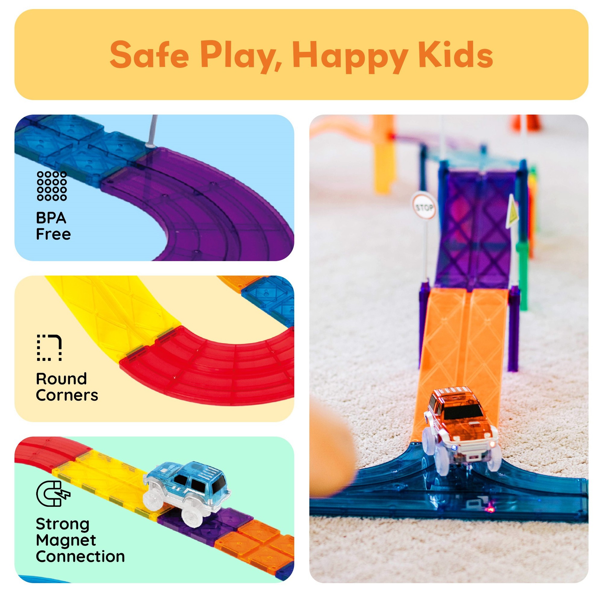 We place safety above all else. Our PicassoTiles toy sets are BPA-free and non-toxic, creating a safe environment for your child's playtime. Every magnetized tile is thoughtfully shaped with smooth edges, enhancing the protective shield against any accidental cuts or bumps. With us, you're not only guaranteeing enjoyable amusement, but also embracing the peace of mind that comes from knowing your little ones exploration is shielded from harmful elements.
