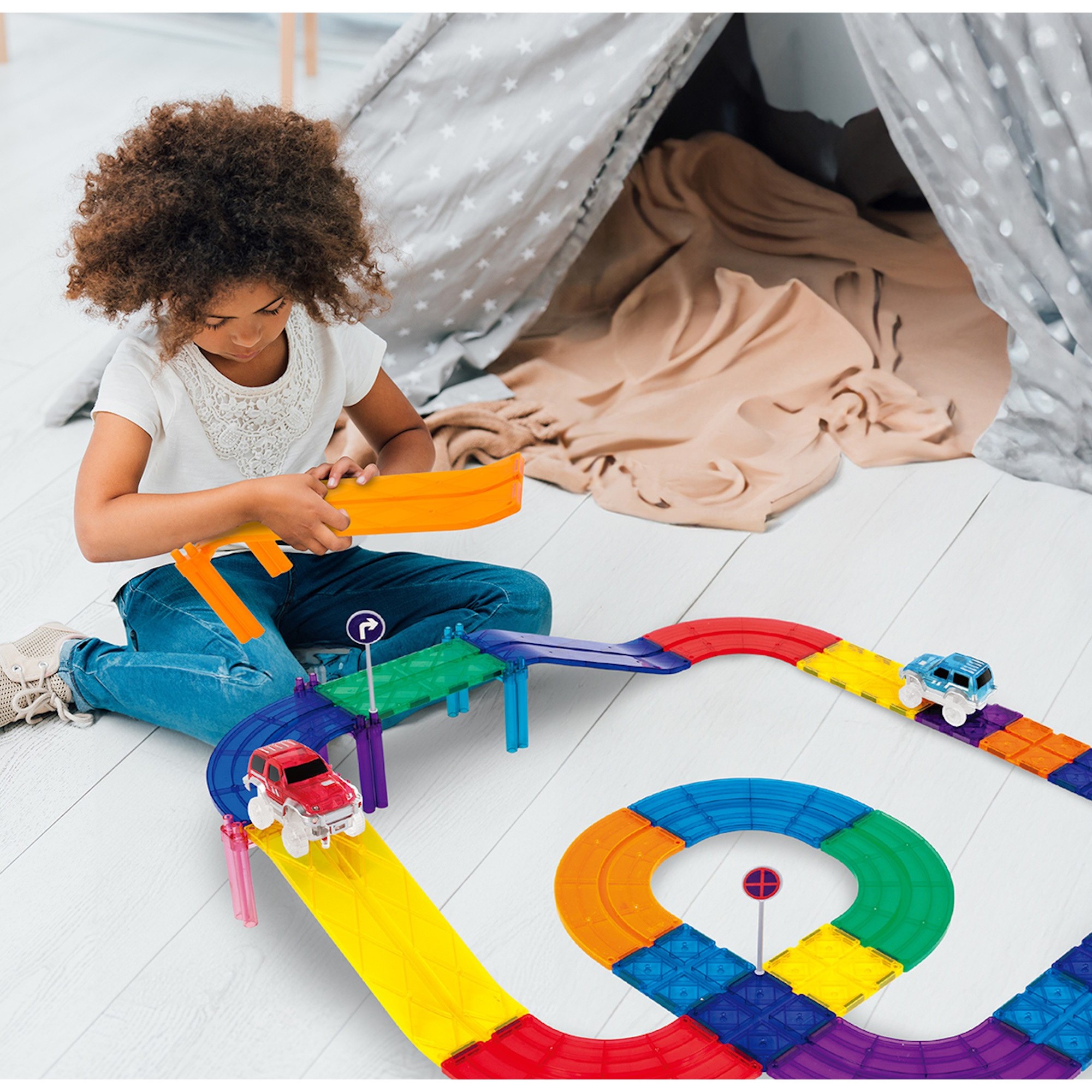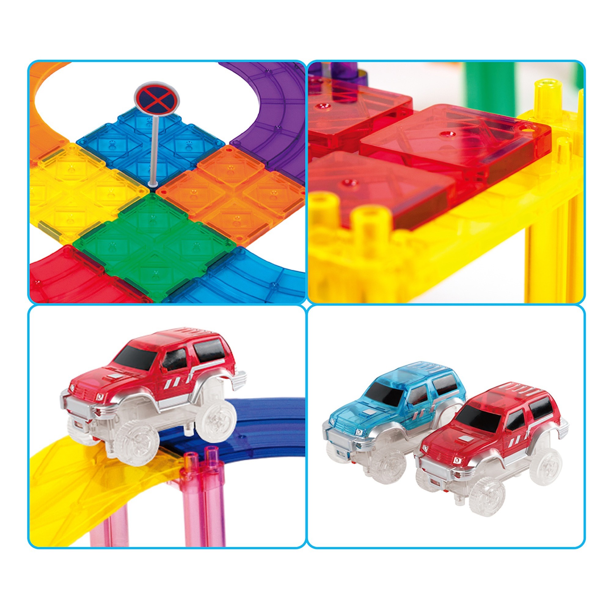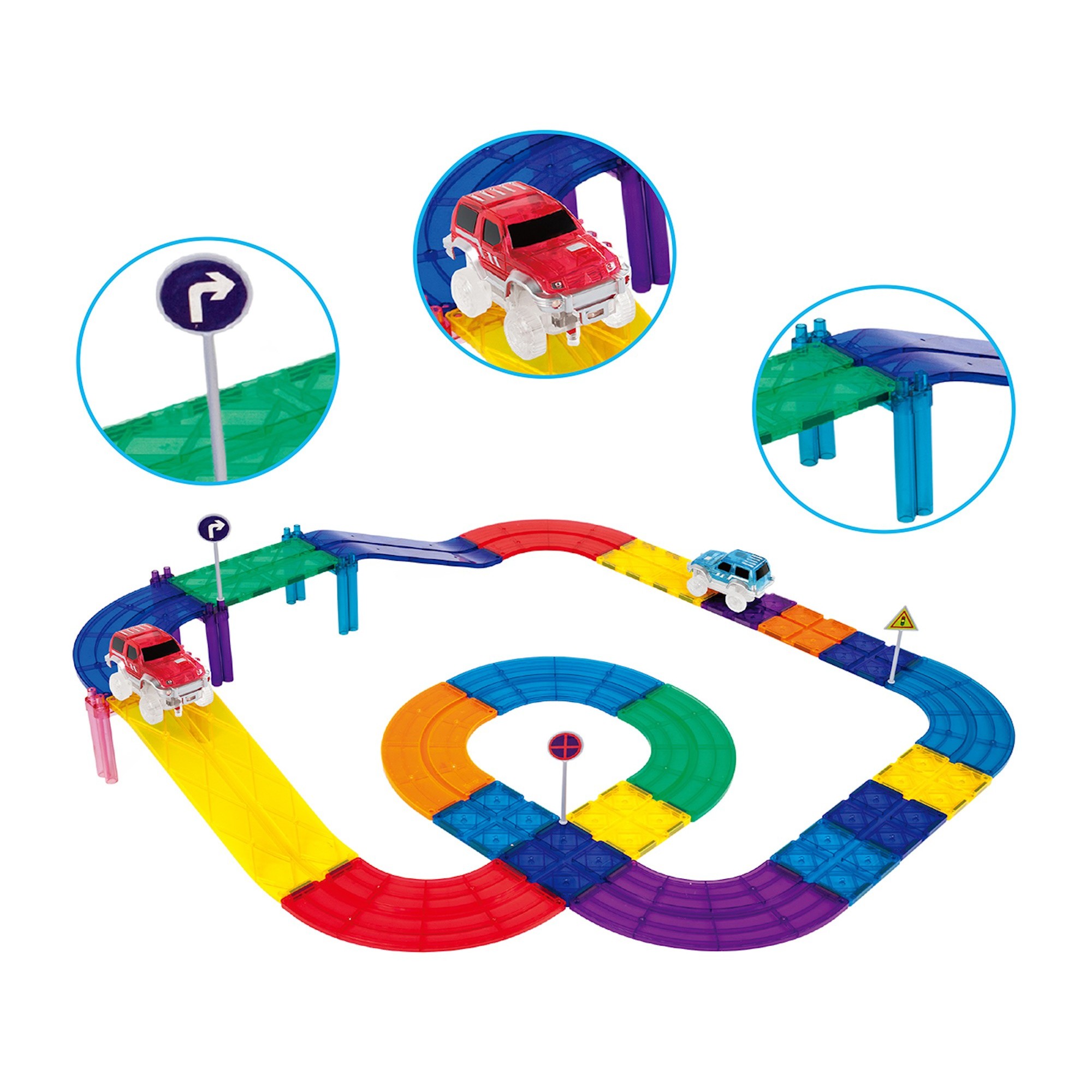 PicassoTiles magnetic race track set (PTR30) includes 30 magnetic tiles, ramps, and cars for building exciting 3D racecourses. This magnetic tile race track lets kids design multi-level tracks, race vehicles, and develop creativity, problem-solving, and STEM skills.