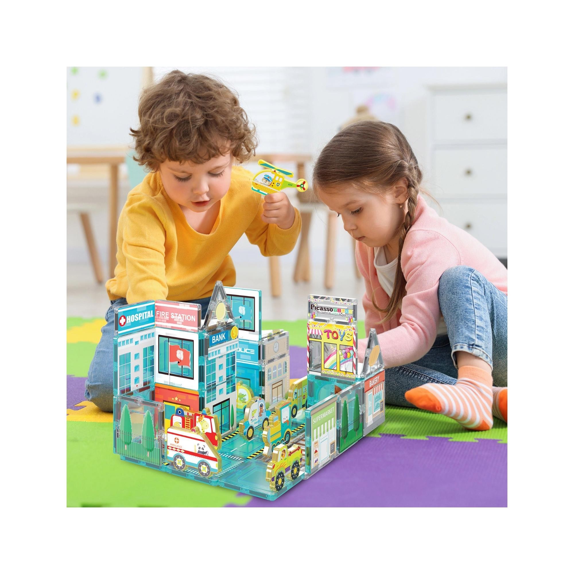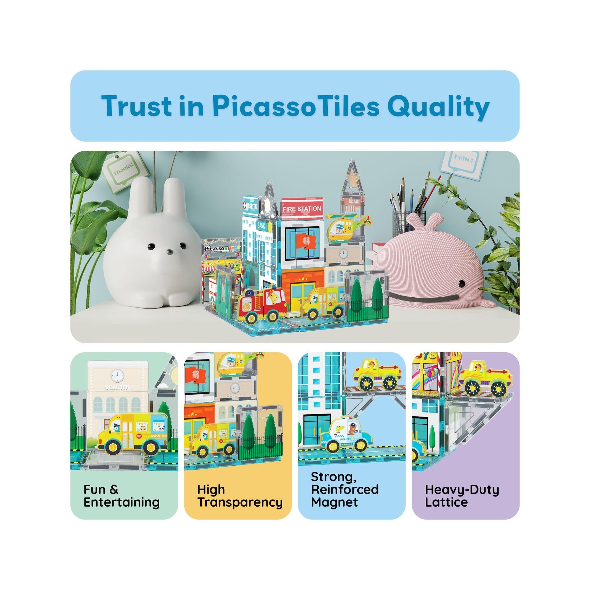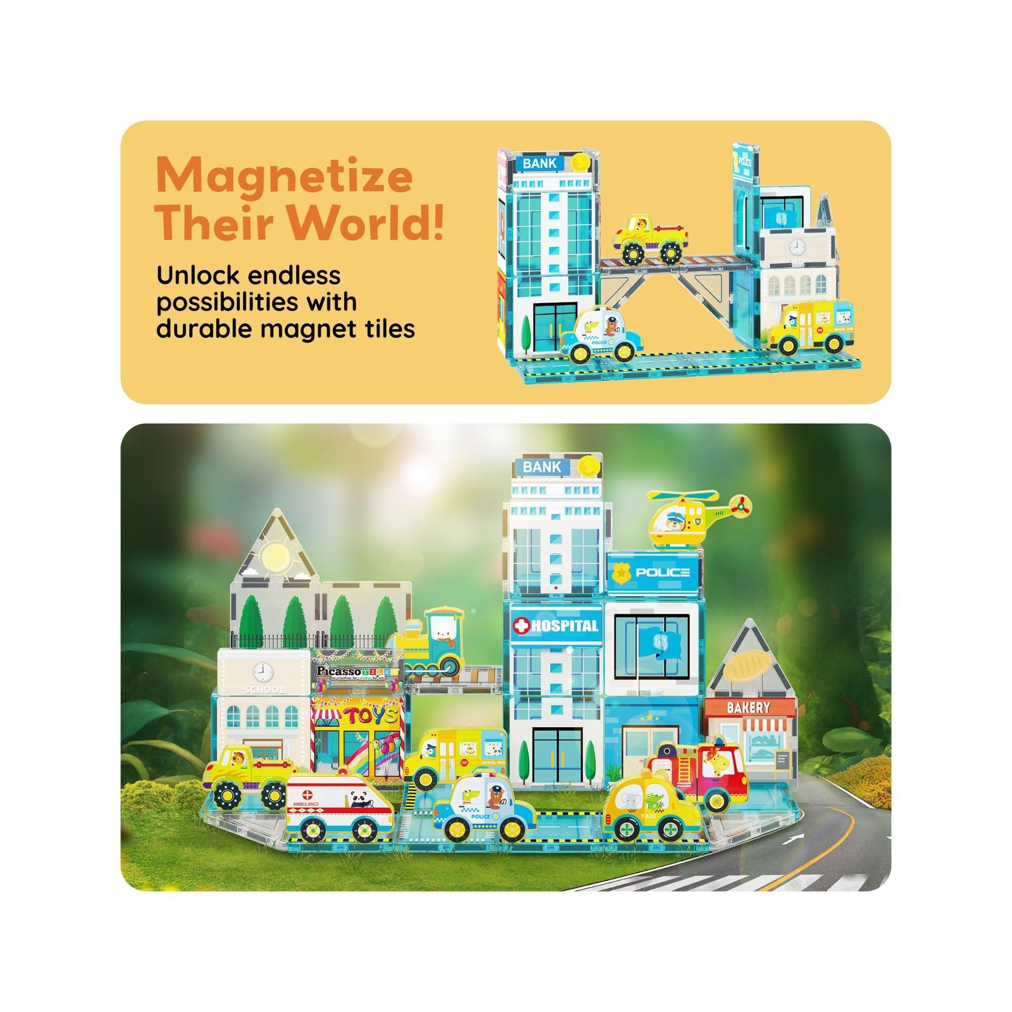 PicassoTiles metro city magnetic marvels playset (SKU: PTQ14) bursts with urban adventure fun. Featuring magnet tile vehicle character action figures and vibrant city-themed magnetic building block tiles, it will inspire budding architects.