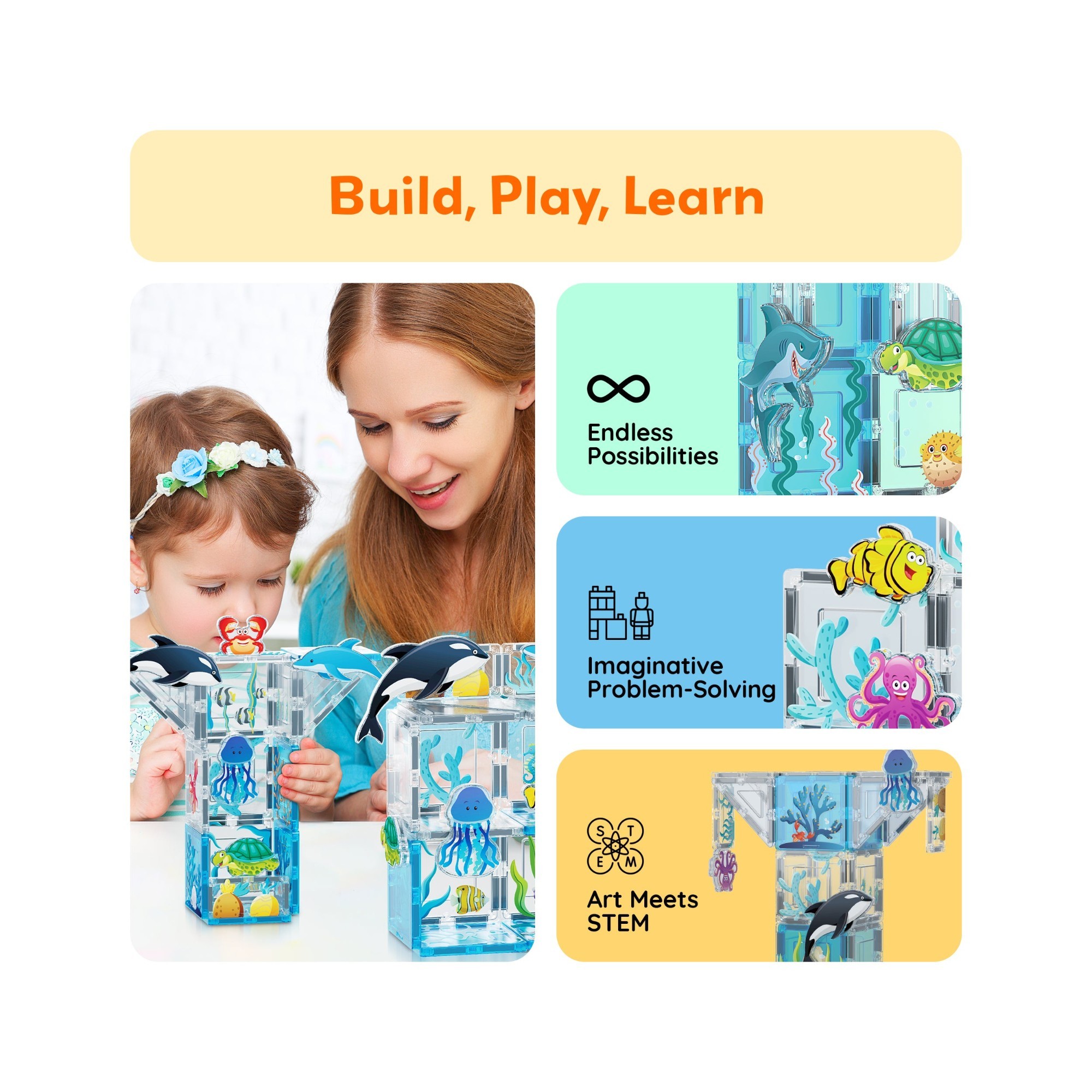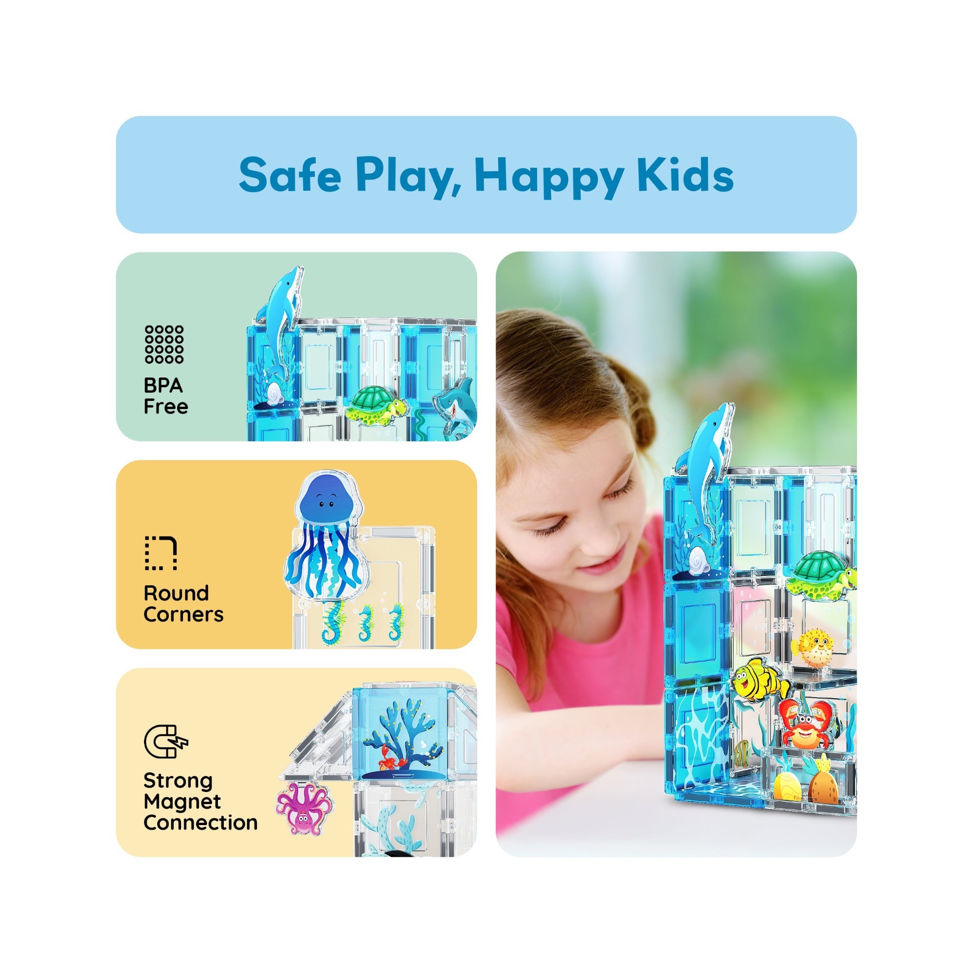 PicassoTiles (PTQ15) magnetic tiles aquarium set brings the ocean to life with printed tiles and 8 marine characters like sharks, dolphins, and jellyfish. Kids can design underwater habitats, build colorful scenes, and grow their motor skills through imaginative summer play.