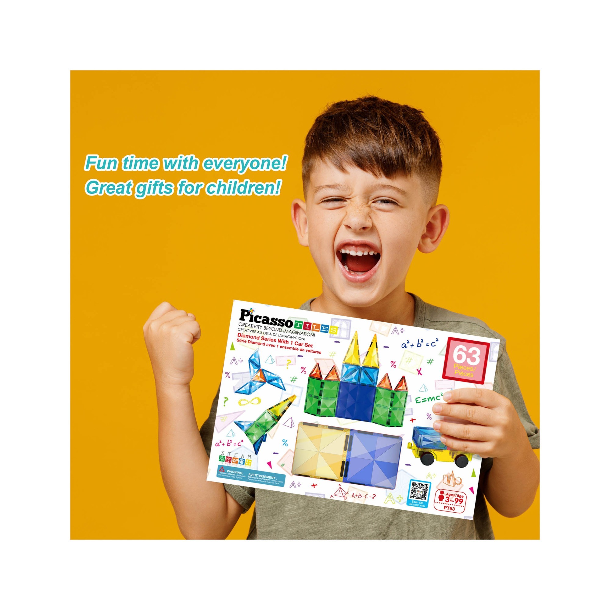 PicassoTiles 63 piece diamond-surfaced magnetic tile building blocks (SKU: PT63) offer options to design creative possibilities for budding engineers and architects. Each set comes with a base vehicle, providing a stable foundation for constructing a car or truck tile vehicle. Let your child's imagination soar as they explore the world of magnetic building with PicassoTiles.