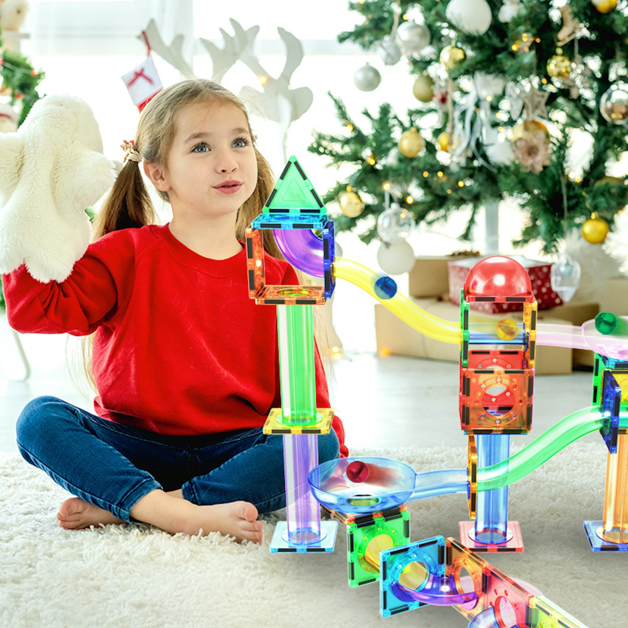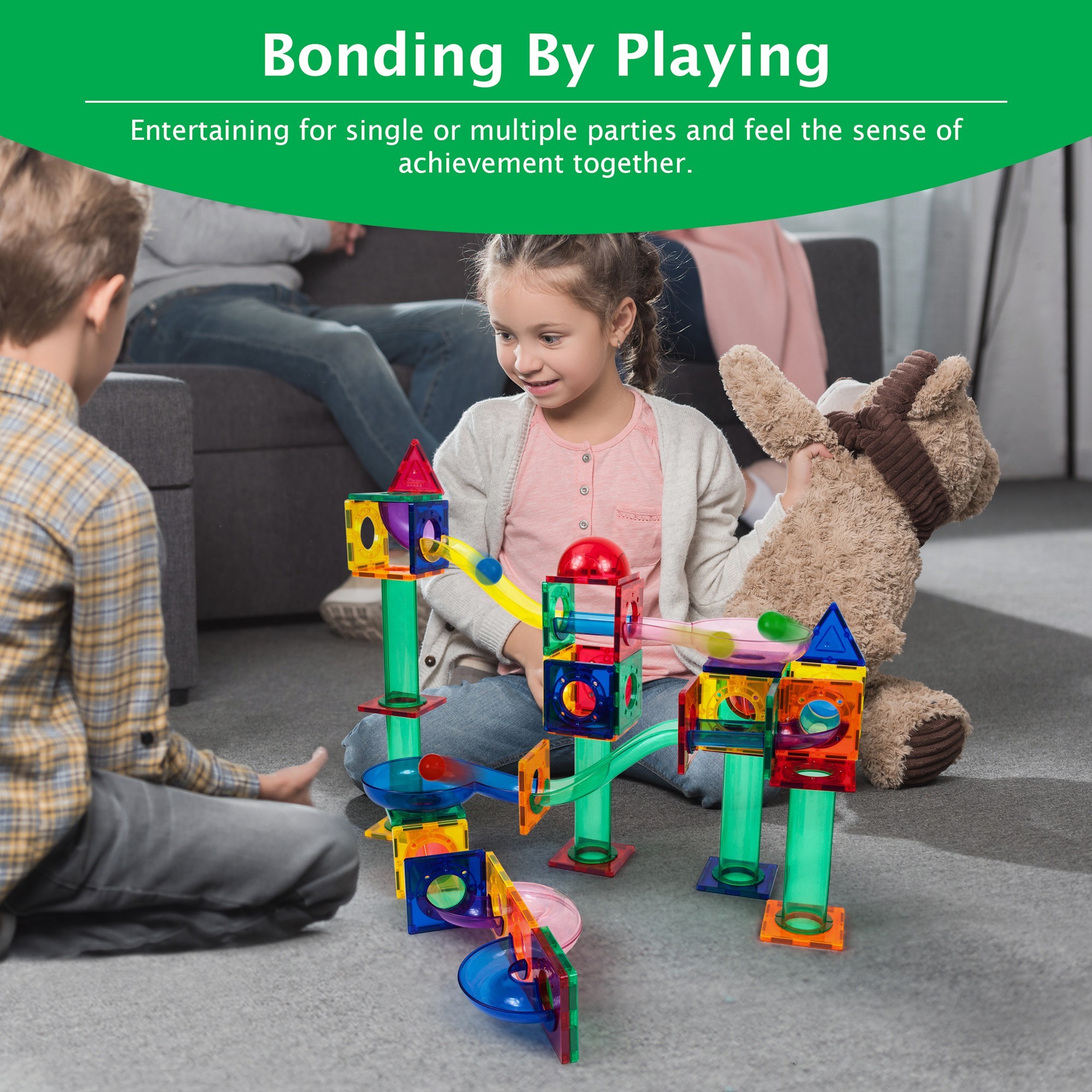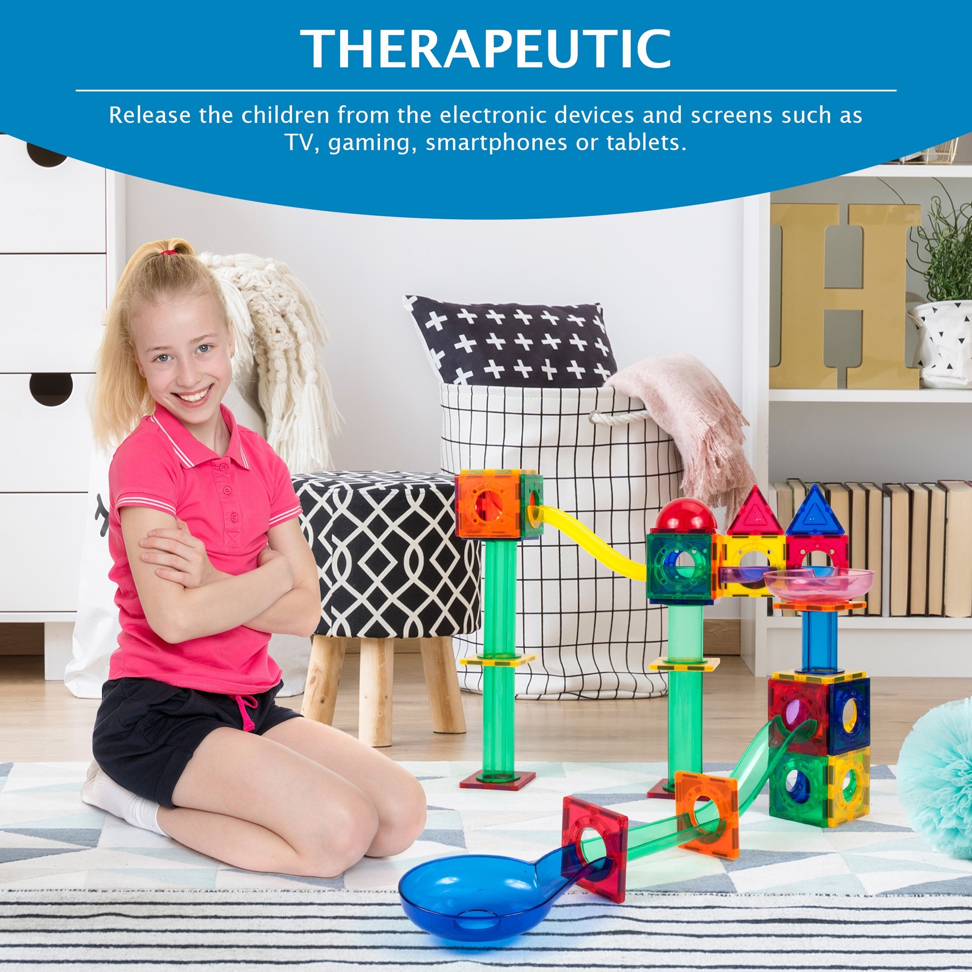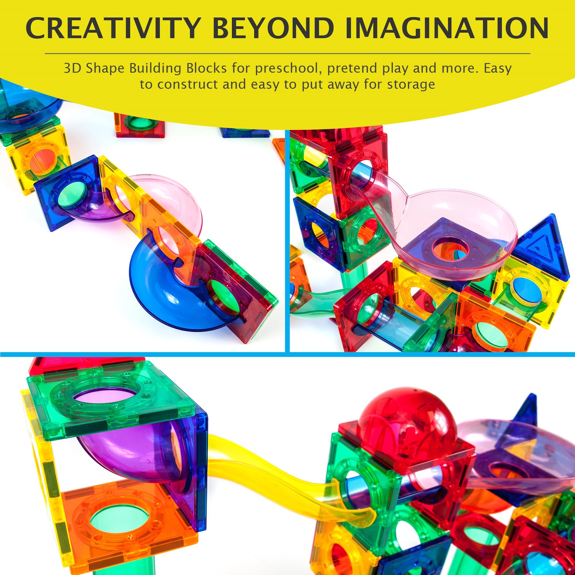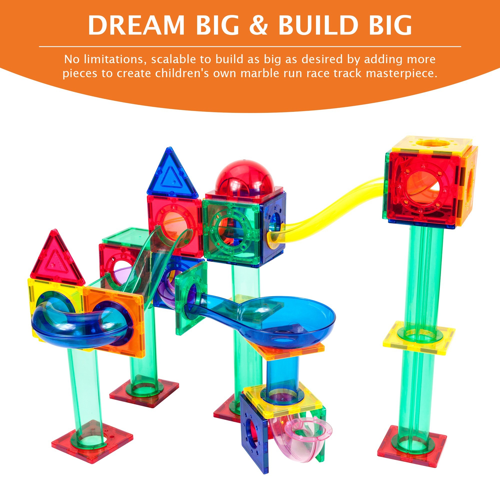 •Build wild marble run designs with colorful magnetic tiles and track pieces