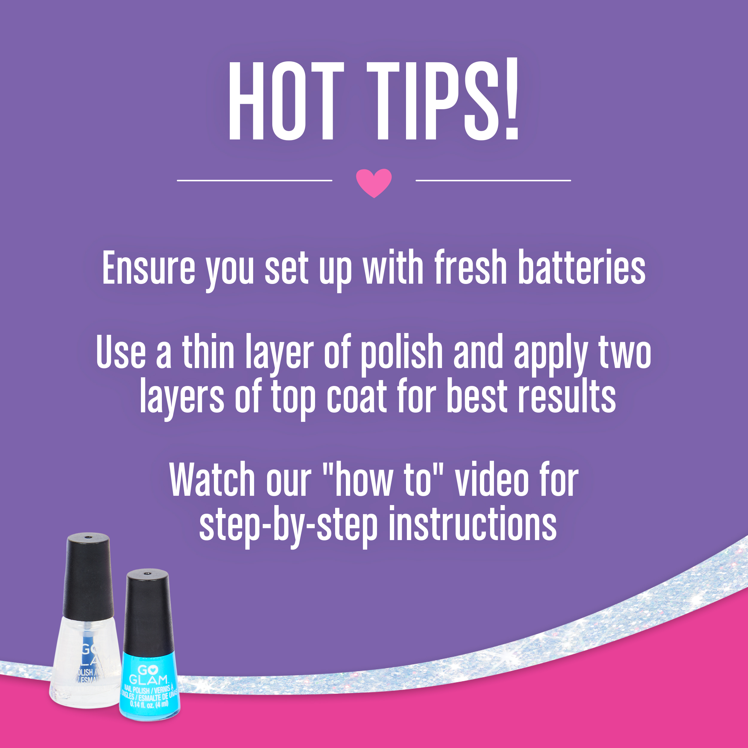 Includes: 1 GO GLAM U-nique Nail Salon with Dryer and Portable Stamper, 5 Design Pods, 2 GO GLAM Nail Polishes, 1 GO GLAM Top Coat, 1 Toe Separator, 1 Instruction Sheet