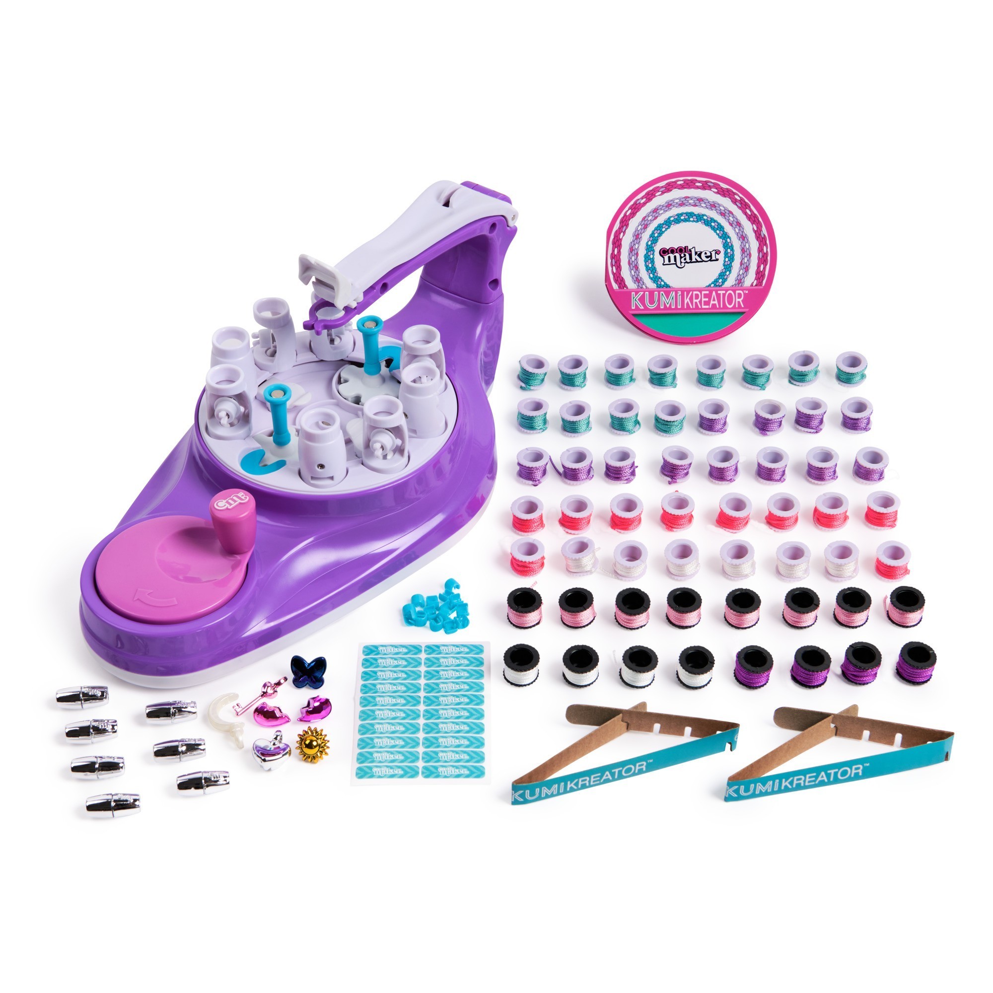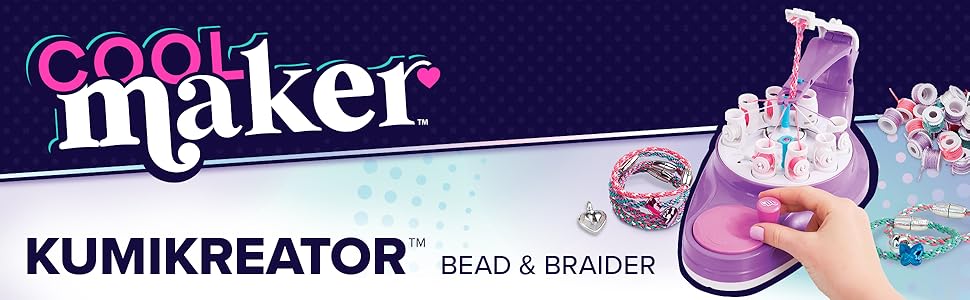 - Includes: 1 Cool Maker KumiKreator Bead & Braider, 56 Spools, 7 Beads, 7 Clasps, 14 End Caps, 1 Clasp Sticker Sheet, 2 Measuring Guides, 1 Design Booklet, 1 Instruction Guide