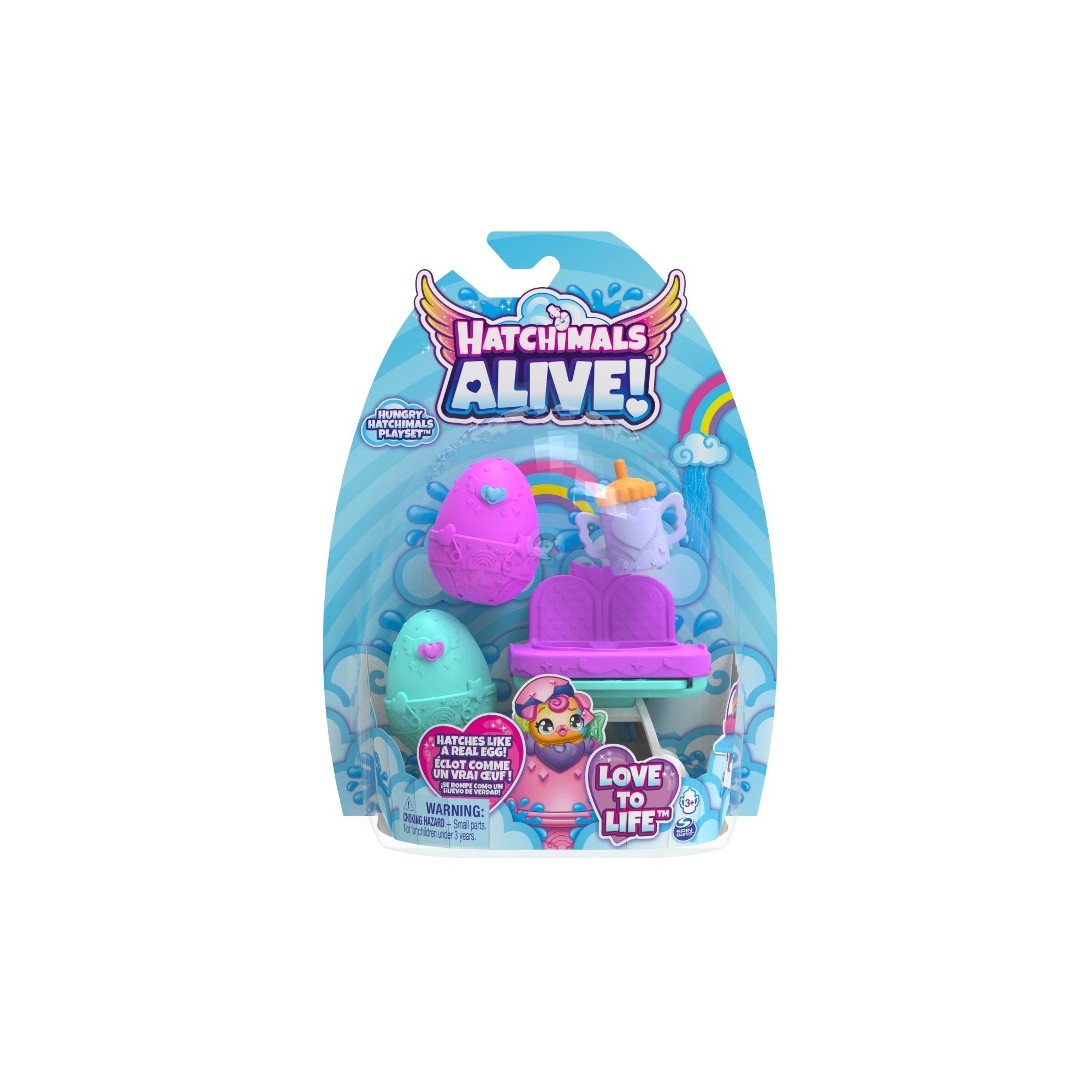 Experience endless feeding fun with the Hatchimals Alive Hungry Hatchimals Playset! With your love and care, super cute Hatchimals Alive characters magically come to life in a whole new way. Their self-hatching eggs hatch like real eggs when activated by water! This playset includes two colorful Hatchimals eggs with two characters, a bottle, two pacifiers and a rainbow cloud themed highchair. To start hatching, remove the pacifiers from the eggs, fill the bottle with water and squeeze it into the eggs. In seconds, your sweet new friends will start revealing themselves, cracking through the eggs! Place your hungry Hatchimals in the highchair and use your imagination to create mealtime pretend play adventures. The chair's tray pulls out and the bottle and pacifiers add to your storytelling! For even more ways to play, look for the Hatch N' Stroll Playset and the Hatchi-Nursery Playset (each sold separately)! Hatchimals toys for kids are perfect for those who enjoy collectibles, action figures, small toys, dolls, and doll house play. Great birthday gifts, Christmas gifts, stocking stuffers or gifts for any occasion for ages 3 and up. Build out your Hatchimals world with the Hatchimals Alive Hungry Hatchimals Playset!
