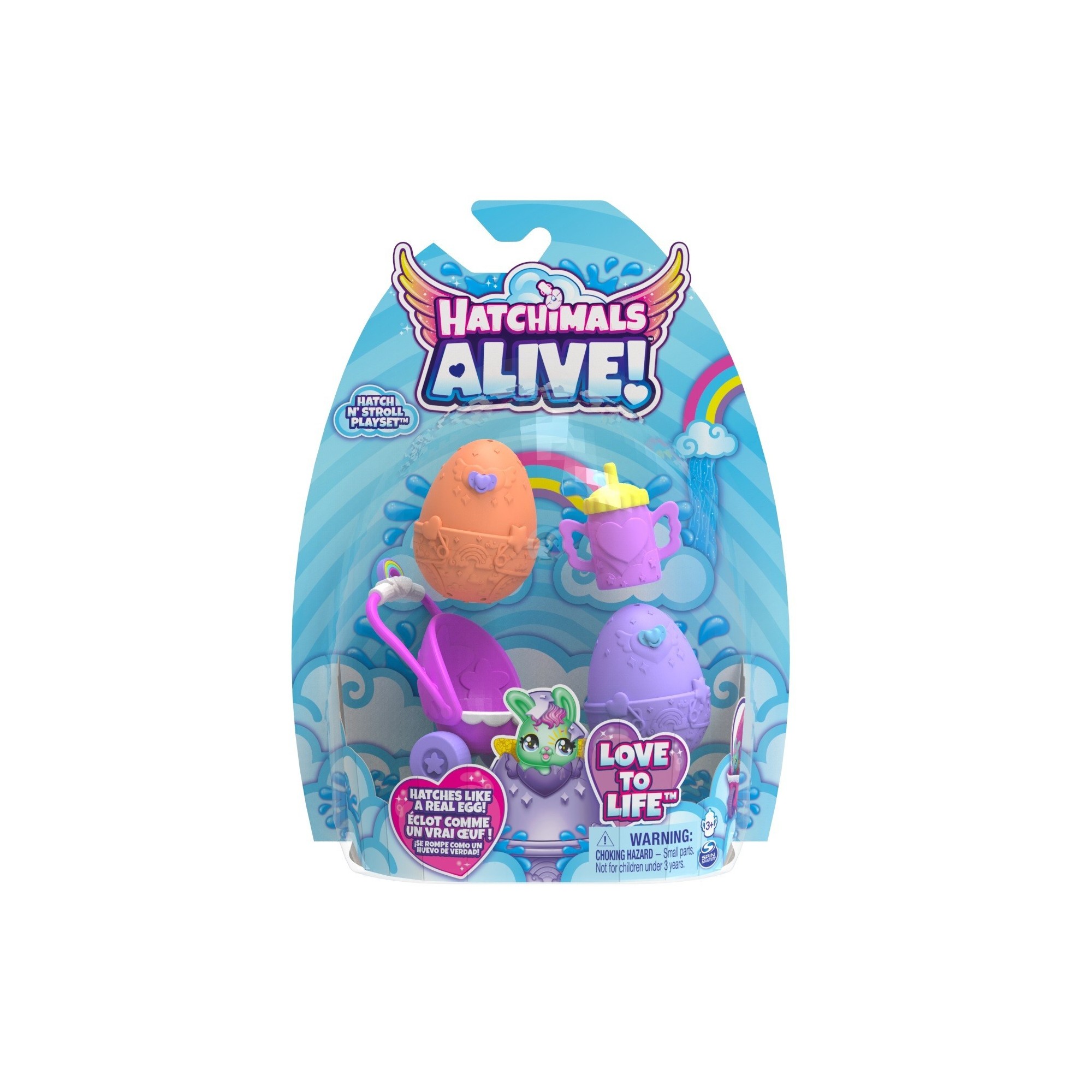 Take your Hatchimals for a stroll with the Hatchimals Alive Hatch N' Stroll Playset! With your love and care, super cute Hatchimals Alive characters magically come to life in a whole new way. Their self-hatching eggs hatch like real eggs when activated by water! This playset includes two colorful Hatchimals eggs with two characters, a bottle, two pacifiers and a stroller. To start hatching, remove the pacifiers from the eggs, fill the bottle with water and squeeze it into the eggs. In seconds, your sweet new friends will start revealing themselves, cracking through the eggs! Place your Hatchimals in the stroller and use your imagination to create pretend play adventures. Push your characters around with the stroller's working wheels and add to your storytelling with the bottle and pacifiers! For even more ways to play, look for the Hungry Hatchimals Playset and the Hatchi-Nursery Playset (each sold separately)! Hatchimals toys for kids are perfect for those who enjoy collectibles, action figures, small toys, dolls, and doll house play. Great birthday gifts, Christmas gifts, stocking stuffers or gifts for any occasion for ages 3 and up. Build out your Hatchimals world with the Hatchimals Alive Hatch N' Stroll Playset!
