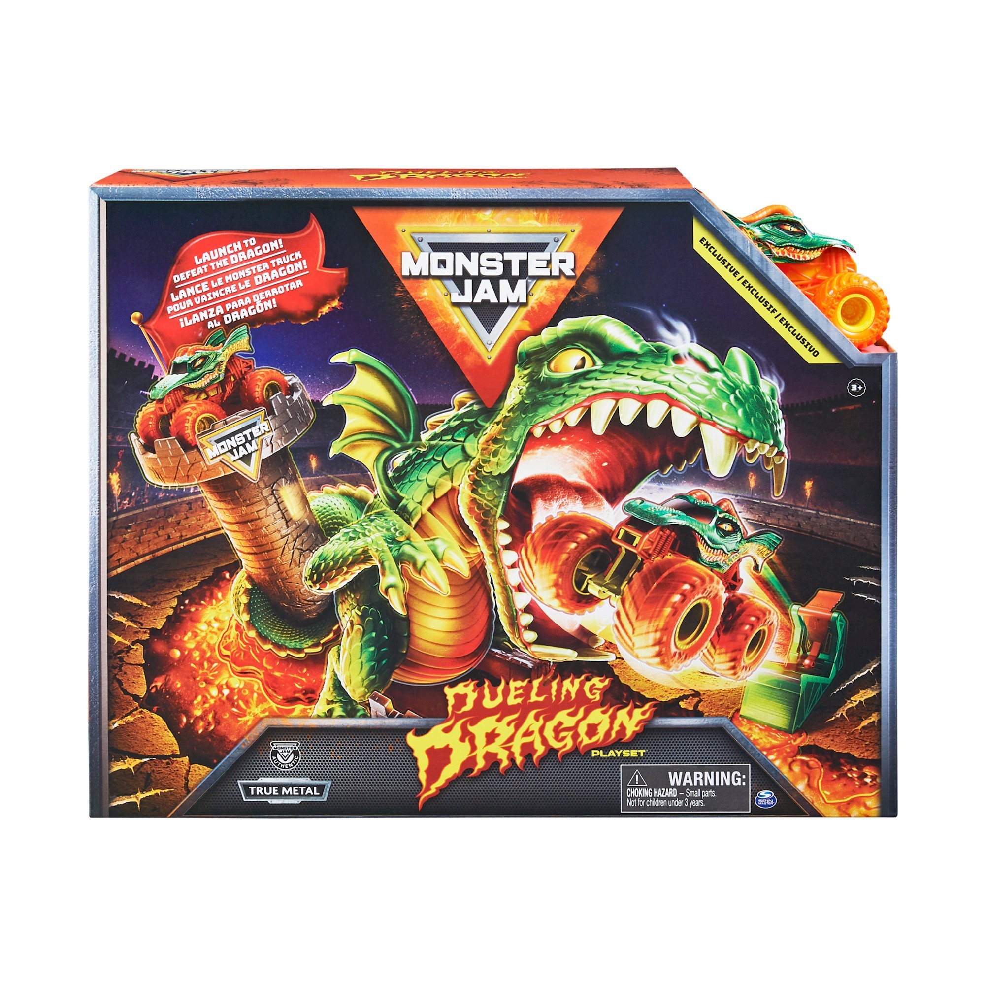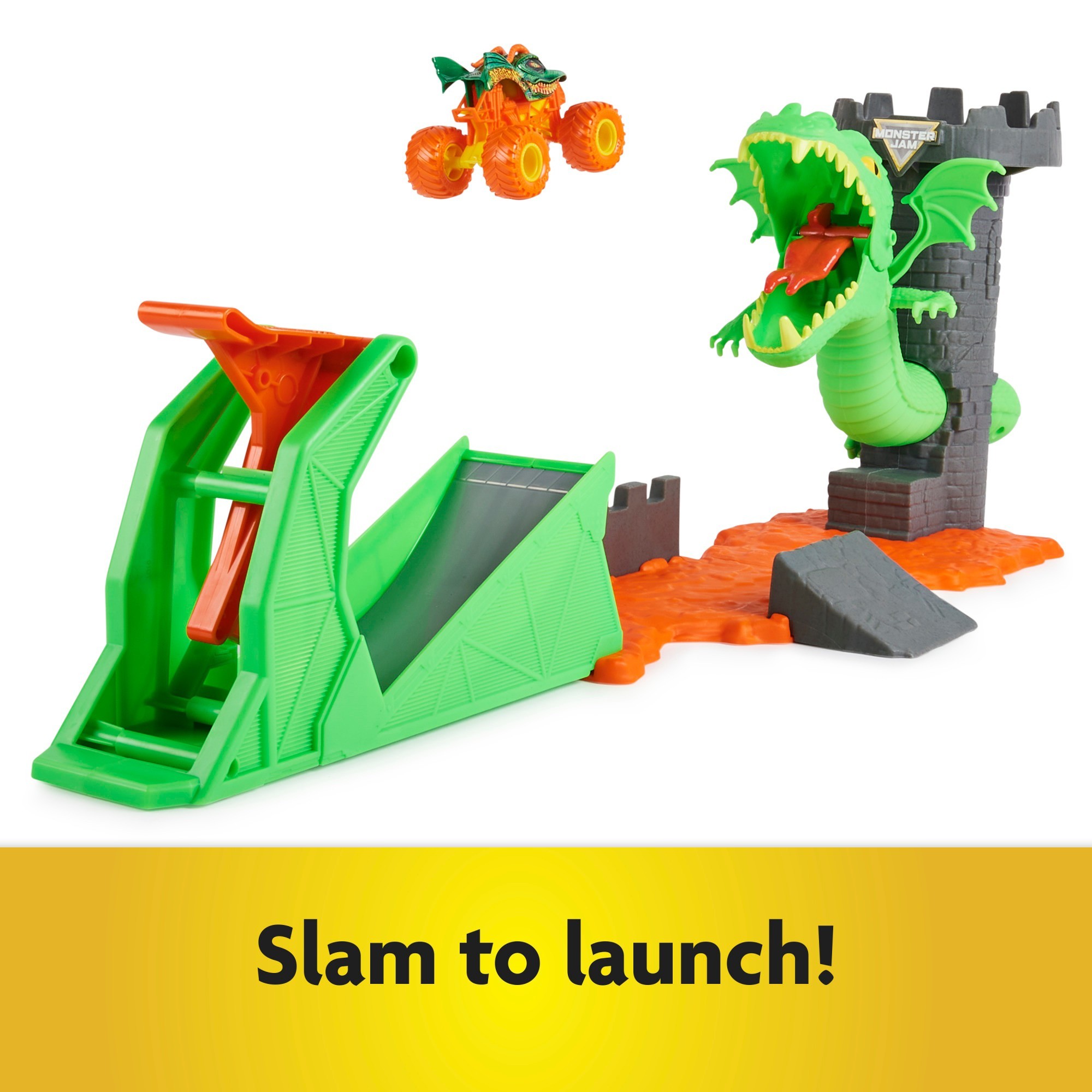 • DEFEAT THE DRAGON: It's Dragon vs. dragon in this action-packed monster truck playset! Slam the launcher, sending your 1:64 scale Monster Jam truck over the lava, landing on the castle turret!