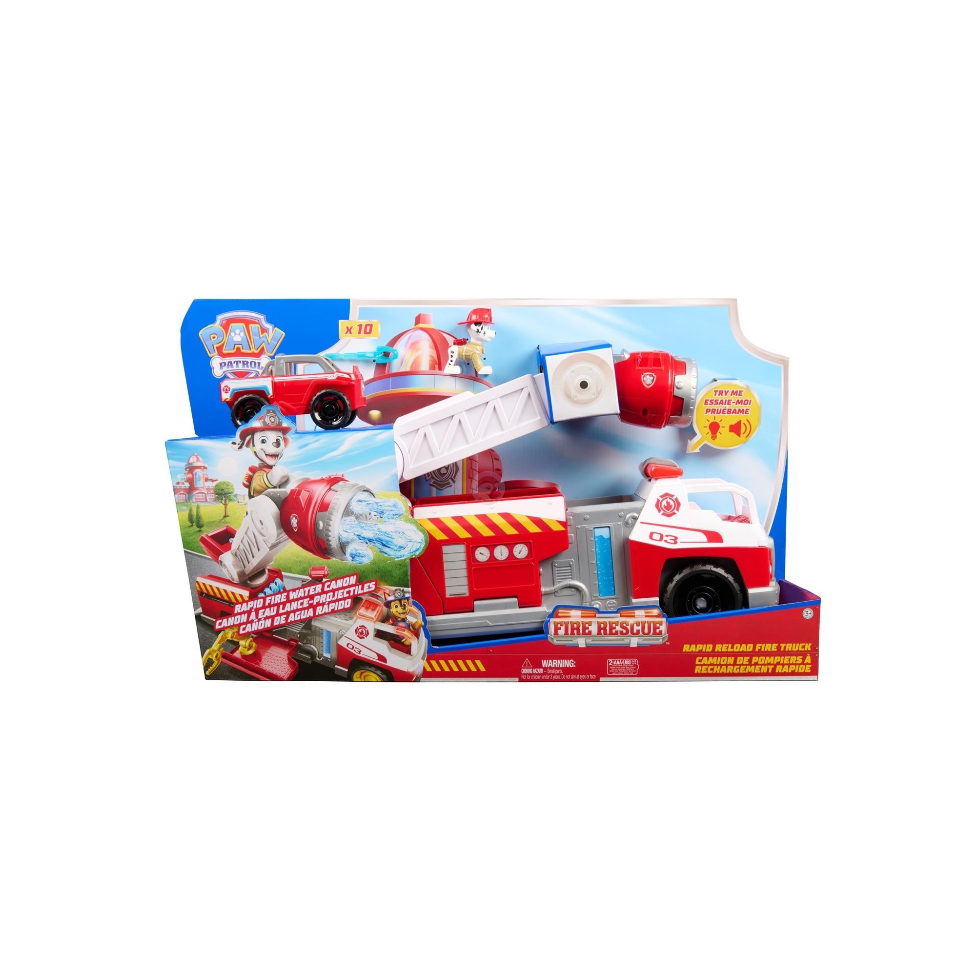 Get ready for thrilling adventures with PAW Patrol Fire Rescue Rapid Reload Fire Truck! This action-packed toy is a hero's dream, featuring Marshall's 20-inch long fire truck with lights, sound effects, and a movable rescue ladder. Kids can rotate the built-in projectile launcher to rapidly fire water projectiles, the drop the ladder back down for a quick reload, so they can quickly launch 5 more, making every mission exciting. Open the truck walls to reveal a platform, rescue arm, and dual projectile launcher. Marshall is dressed in fire rescue gear and can be placed in the rear bucket, ready to drop into the mini rescue vehicle for quick action. Lower the rear door to launch the mini vehicle into thrilling adventures! These PAW Patrol learning toys are PAWsome for a birthday, Christmas, or any holiday. For even more fun, combine with the Fire Rescue Command Center, & six different Fire Rescue figures & vehicles, so the excitement never ends. (each sold separately) Relive cherished moments from past PAW Patrol seasons, like the Mighty Pups and PAW Patrol Movie, or create new adventures with a PAW Patrol tower, individual PAW Patrol action figures and their PAW Patrol vehicles, for turbo-charged adventures.