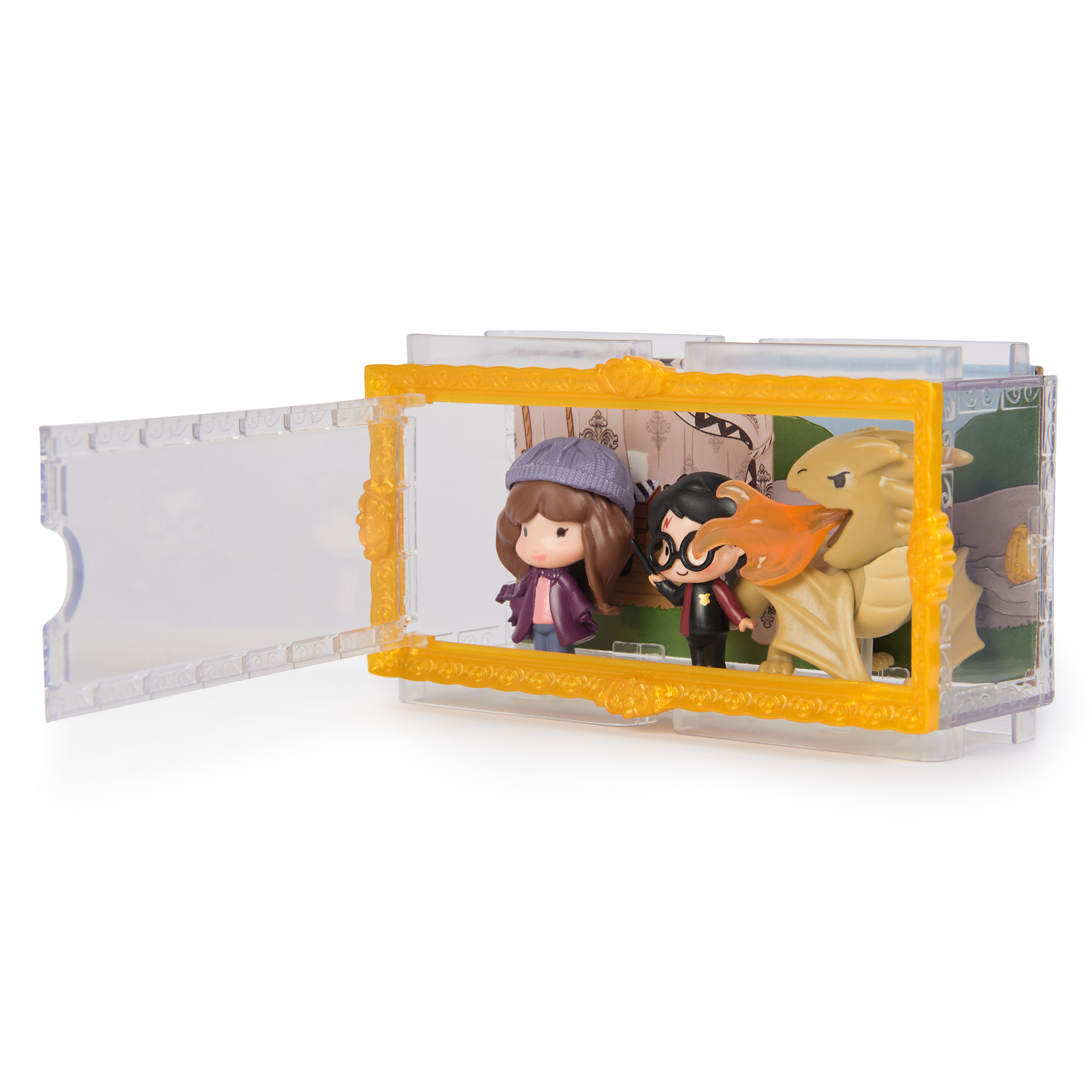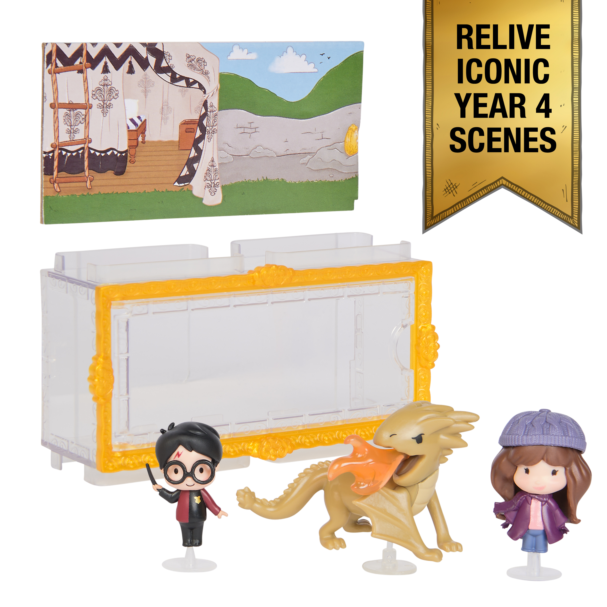Relive memorable Year 4 movie moments from Harry Potter and the Goblet of Fire with the Micro Magical Moments figure sets. This multipack includes 1.5-inch figures of Harry Potter, Hermione Granger and a Hungarian Horntail dragon, a clear portrait frame display case with a double-sided backdrop, and three figure stands. Unbox your characters and discover each toy's adorable details: Harry's Triwizard Tournament outfit, Hermione in her hat and scarf, and the sculpted tail and wings on the Hungarian Horntail. The display case's backdrop depicts the Triwizard Tournament's First Task: retrieving the golden egg being guarded by the dragon, a detail Harry Potter fans and collectors will love. Display the characters on their stands, in the case or stand them up on their own. For more spellbinding display possibilities, the set's case stacks and connects with the other Micro Magical Moments sets and figures (each sold separately). Collect them all to build your own displays and Harry Potter scenes. Harry Potter toys are must-have gifts for girls, boys and fans who enjoy miniature toys, collectibles, wands, action figures, dolls, and doll accessories. Bring home the Micro Magical Moments figure set and expand your wizarding world collection.