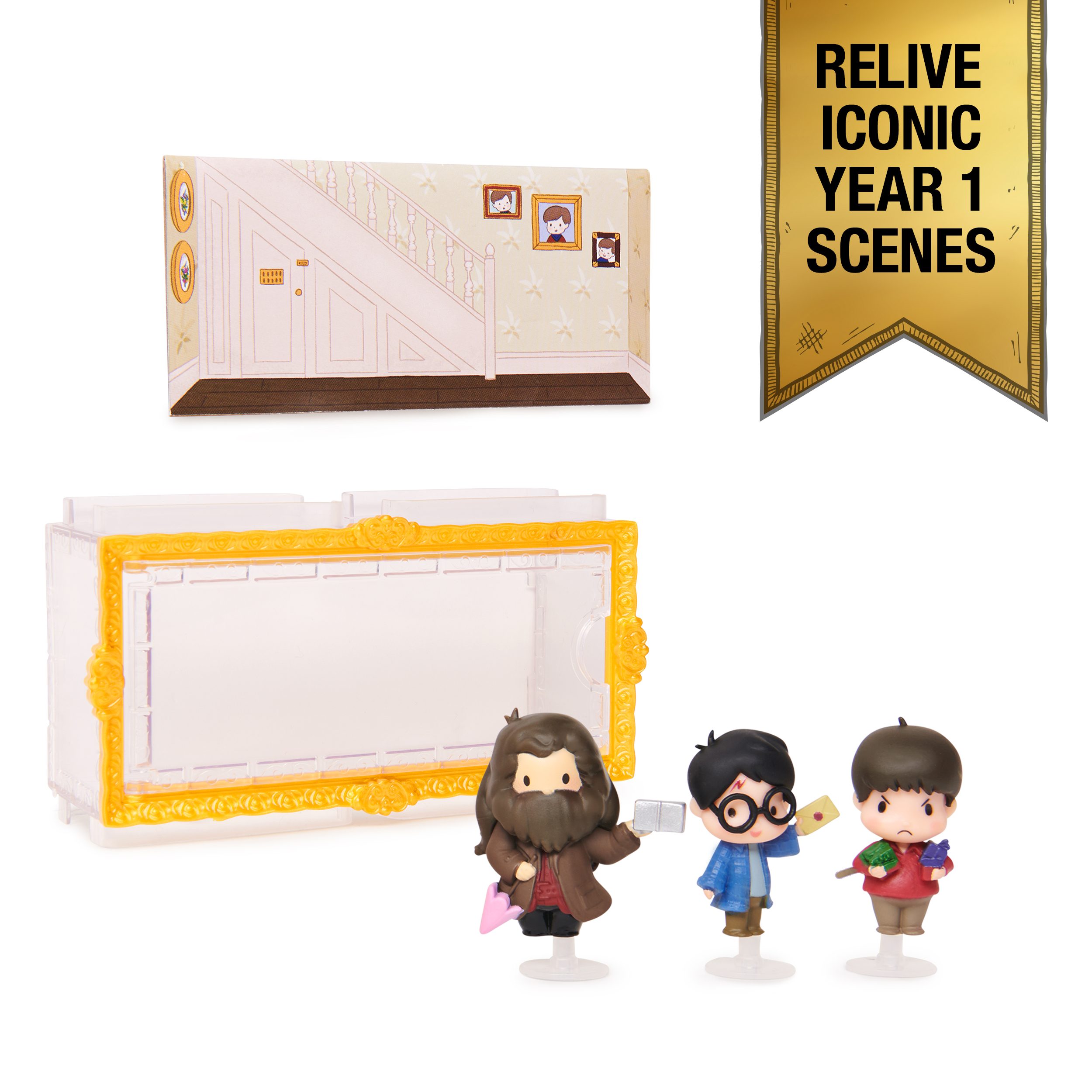 Relive memorable Year 1 movie moments from Harry Potter and the Sorcerer's Stone with the Wizarding World Micro Magical Moments figure sets. This multipack comes with 1.5-inch figures of Harry Potter, Dudley Dursley and Rubeus Hagrid, a clear portrait frame display case, and three figure stands. Unbox your characters and discover their adorable details: Harry holding his Hogwarts letter, an upset Dudley clutching his birthday presents, and Hagrid with his pink umbrella delivering his homemade birthday cake to Harry. The display case's themed backdrop of the Dursley's stairs depicts the iconic cupboard under the stairs, a detail Harry Potter fans and collectors will love. Display the characters on their stands, in the case or stand them up on their own. For even more spellbinding display possibilities, the clear case from this set stacks and connects with the other Micro Magical Moments sets and figures (each sold separately). Collect them all to build out your own unique displays and Wizarding World scenes. Wizarding World Harry Potter toys are must-have gifts for kids and fans who enjoy miniature toys, collectibles, wands, action figures, dolls, and doll accessories. They make a fun birthday gift, Christmas gift or stocking stuffer. Bring home the Harry, Dudley and Hagrid Micro Magical Moments figure set and expand your Wizarding World collection