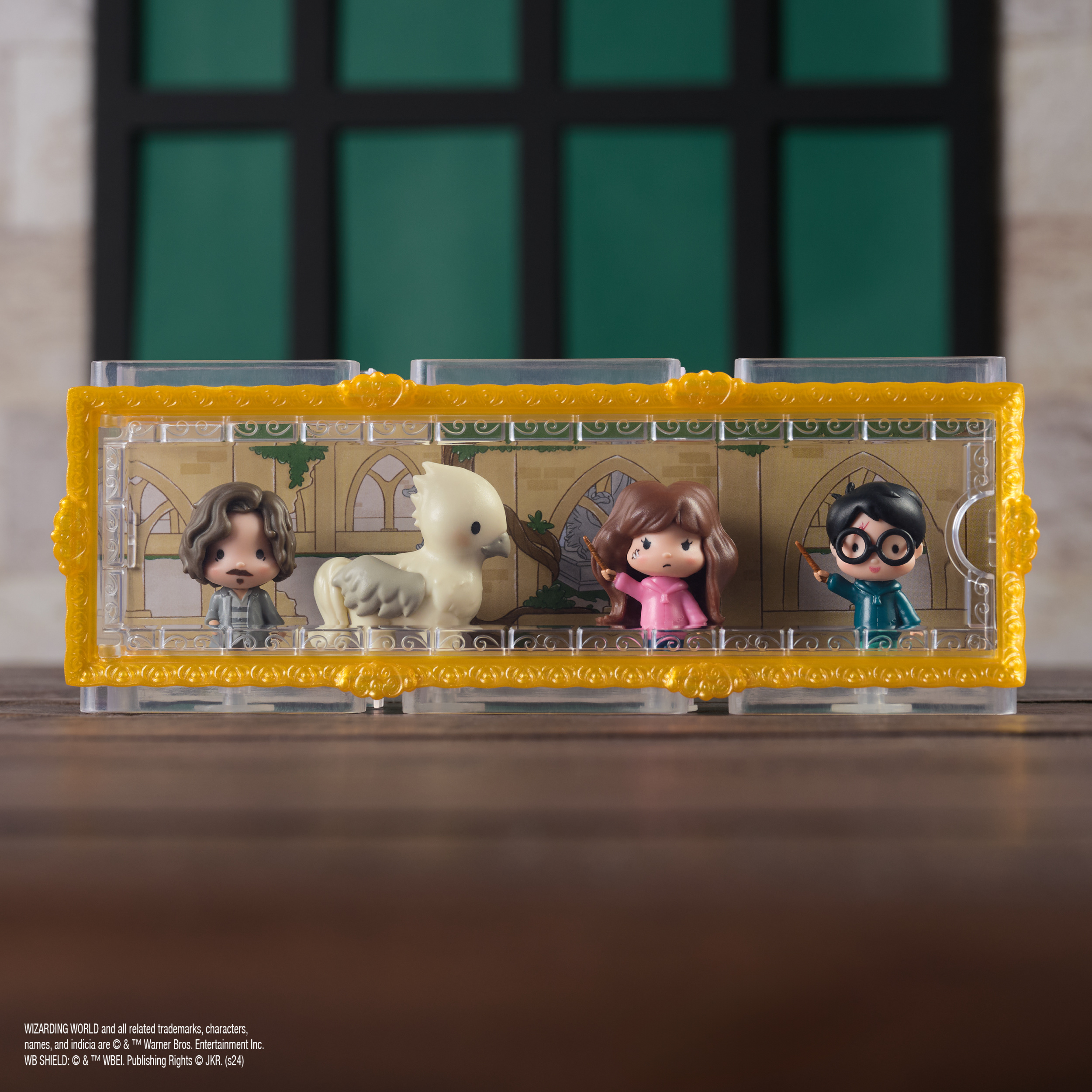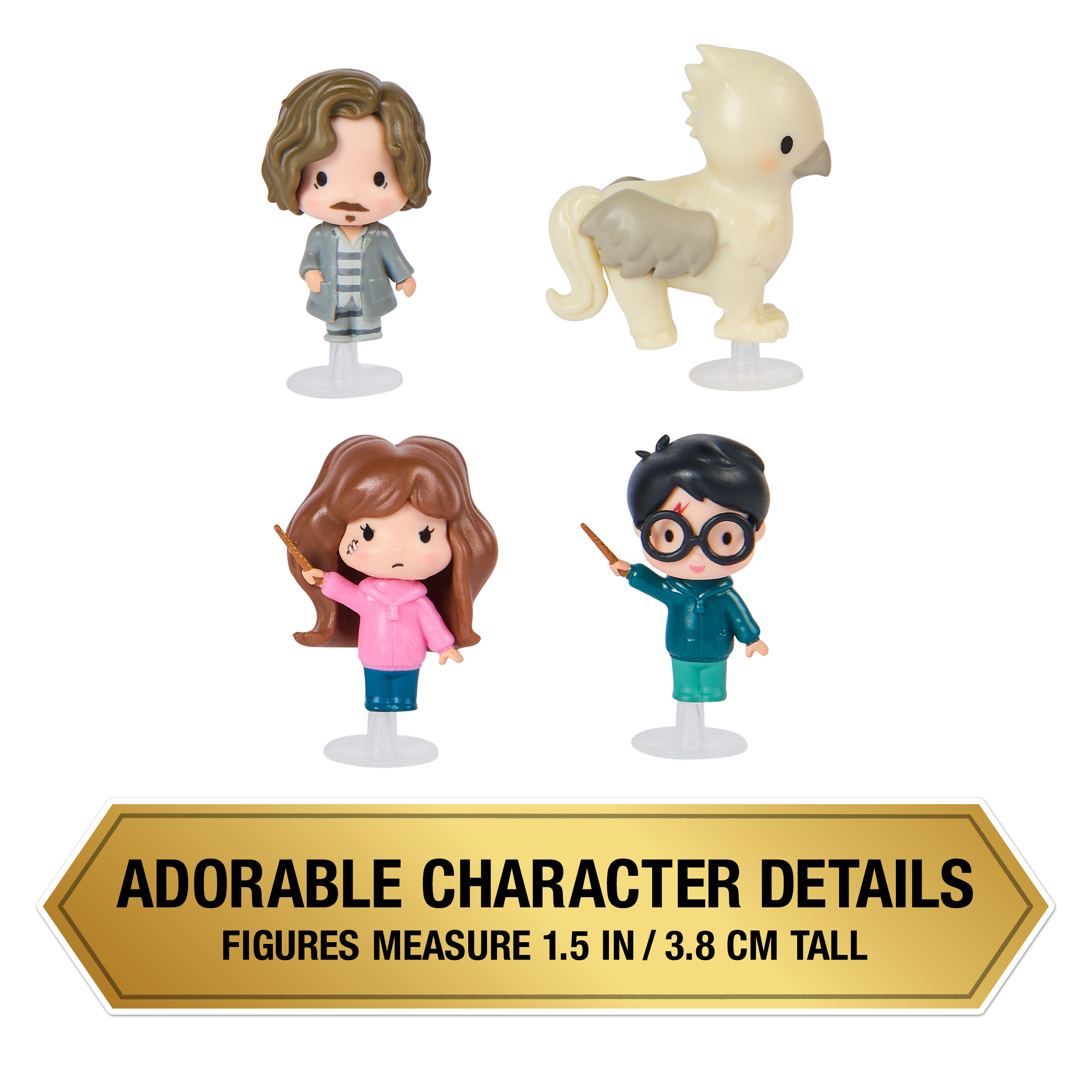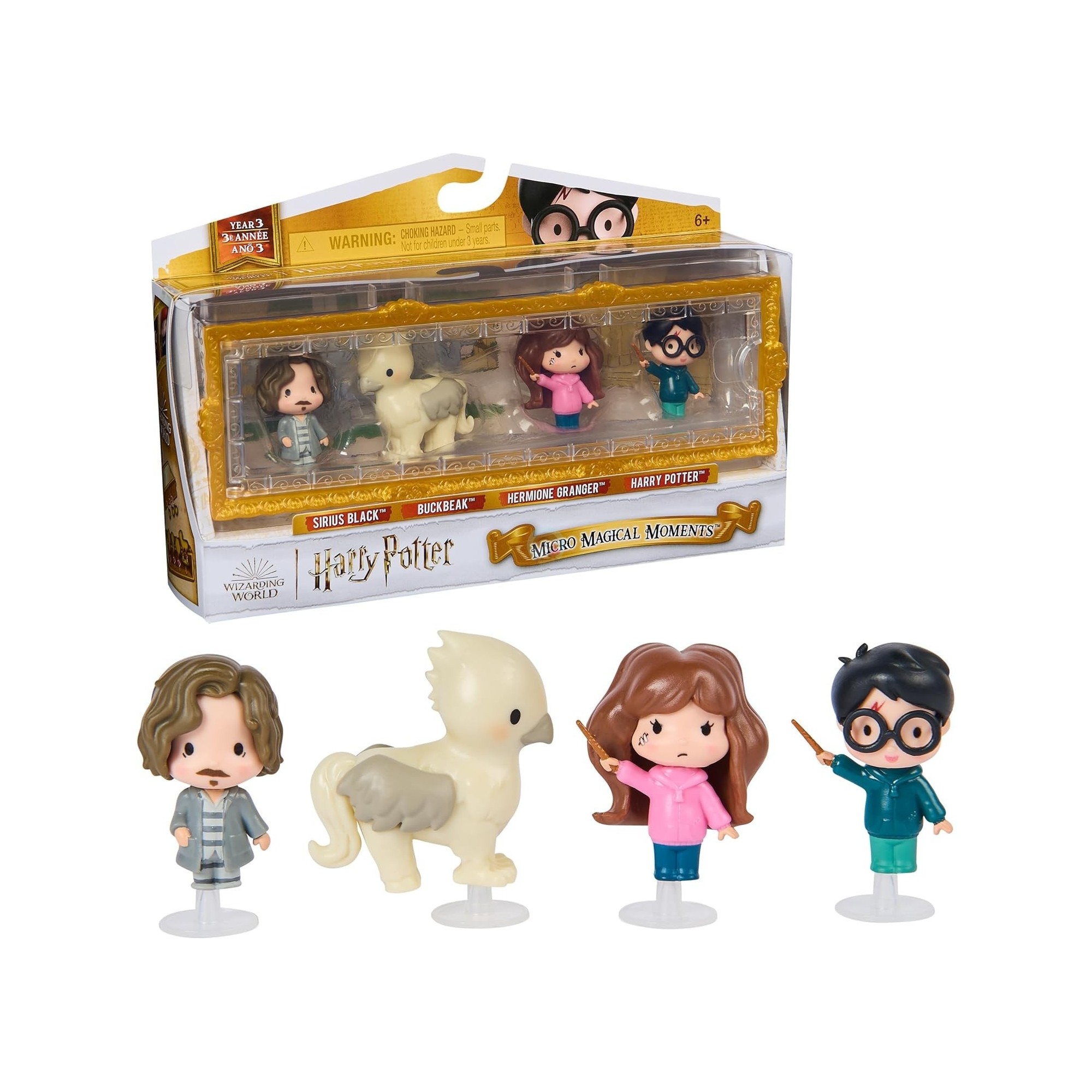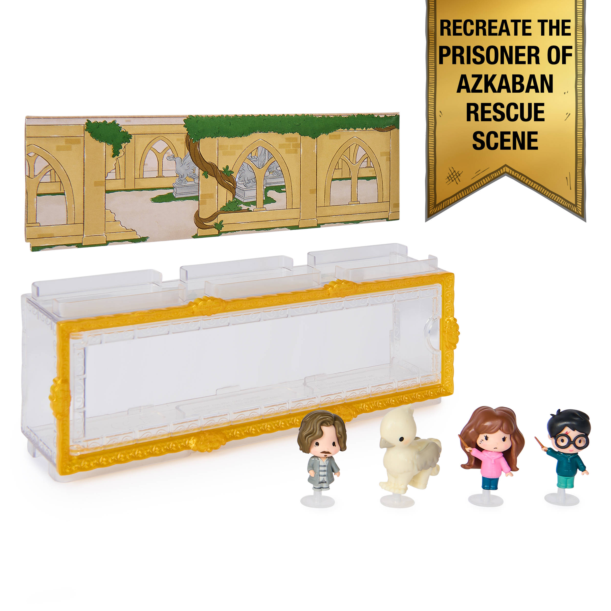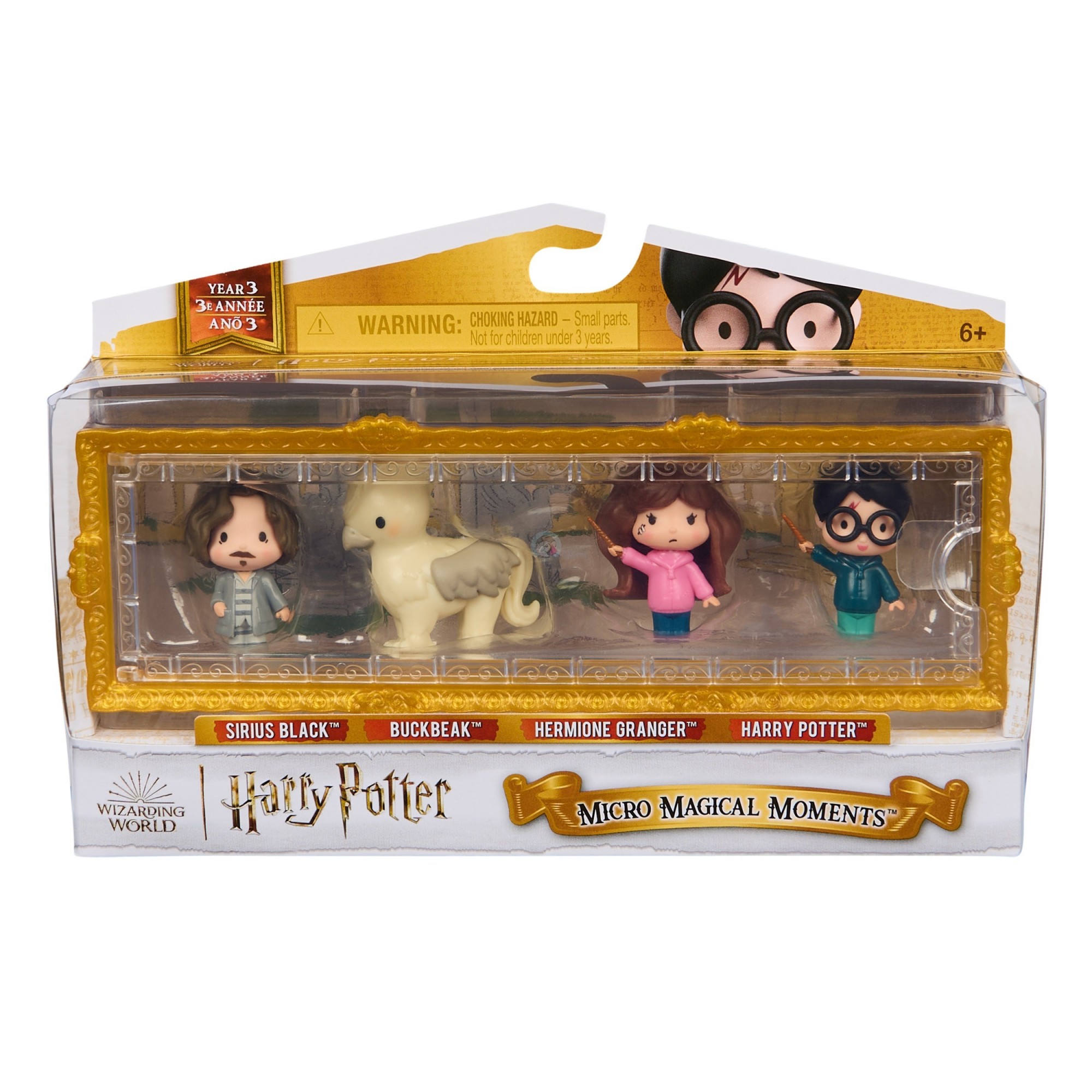 Relive the climactic Year 3 scene from Harry Potter and the Prisoner of Azkaban with the Wizarding World Micro Magical Moments figure set. This deluxe multipack includes 1.5-inch figures of Harry Potter, Hermione Granger, Sirius Black and Buckbeak; a clear portrait frame display case, and four figure stands. Unbox your characters and discover their adorable details: Harry's scar and glasses, Hermione holding her wand, Sirius' striped uniform and Buckbeak's wings. The case's themed backdrop depicts the pivotal rescue scene of Sirius Black and Buckbeak, a detail Harry Potter fans and collectors will love. Display the characters on their stands, in the case or stand them up on their own. For more spellbinding display possibilities, the set's case stacks and connects with the other Micro Magical Moments sets and figures (each sold separately). Collect them all to build out your own unique displays and Wizarding World scenes. Wizarding World Harry Potter toys are must-have gifts for girls, boys and fans who enjoy miniature toys, collectibles, wands, action figures, dolls, and doll accessories. They make a fun birthday gift or gift for any occasion. Expand your Wizarding World collection with the Micro Magical Moments Prisoner of Azkaban rescue scene set.