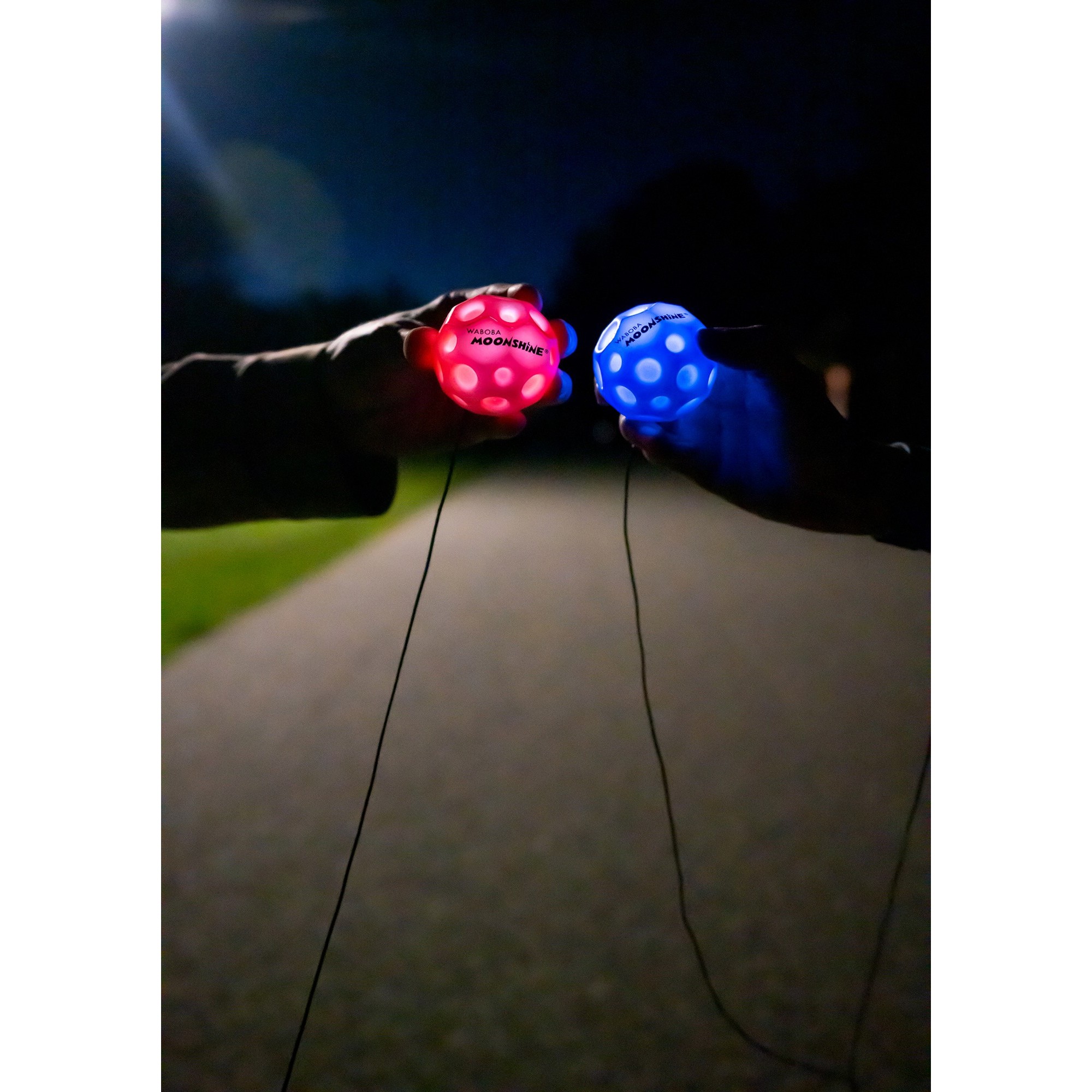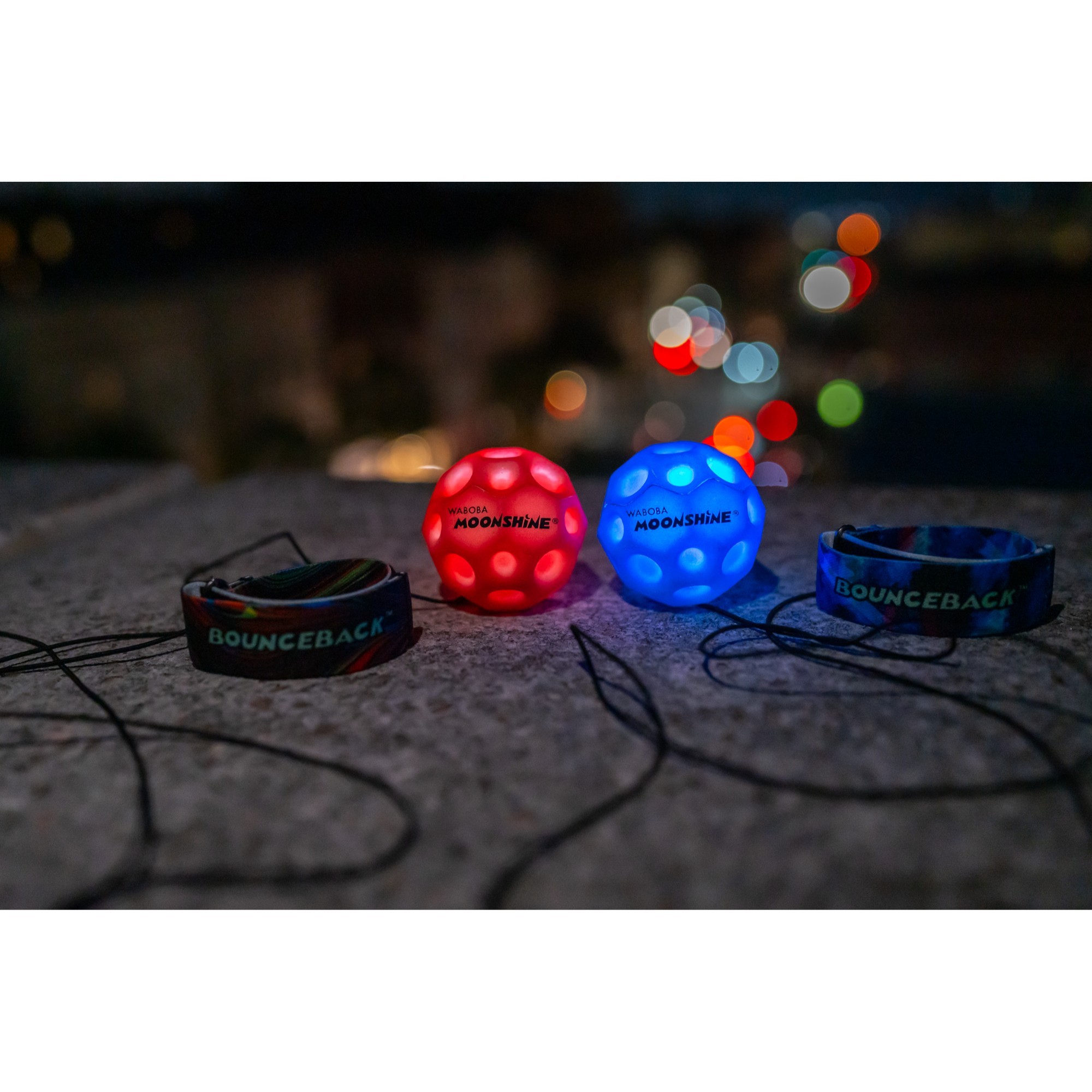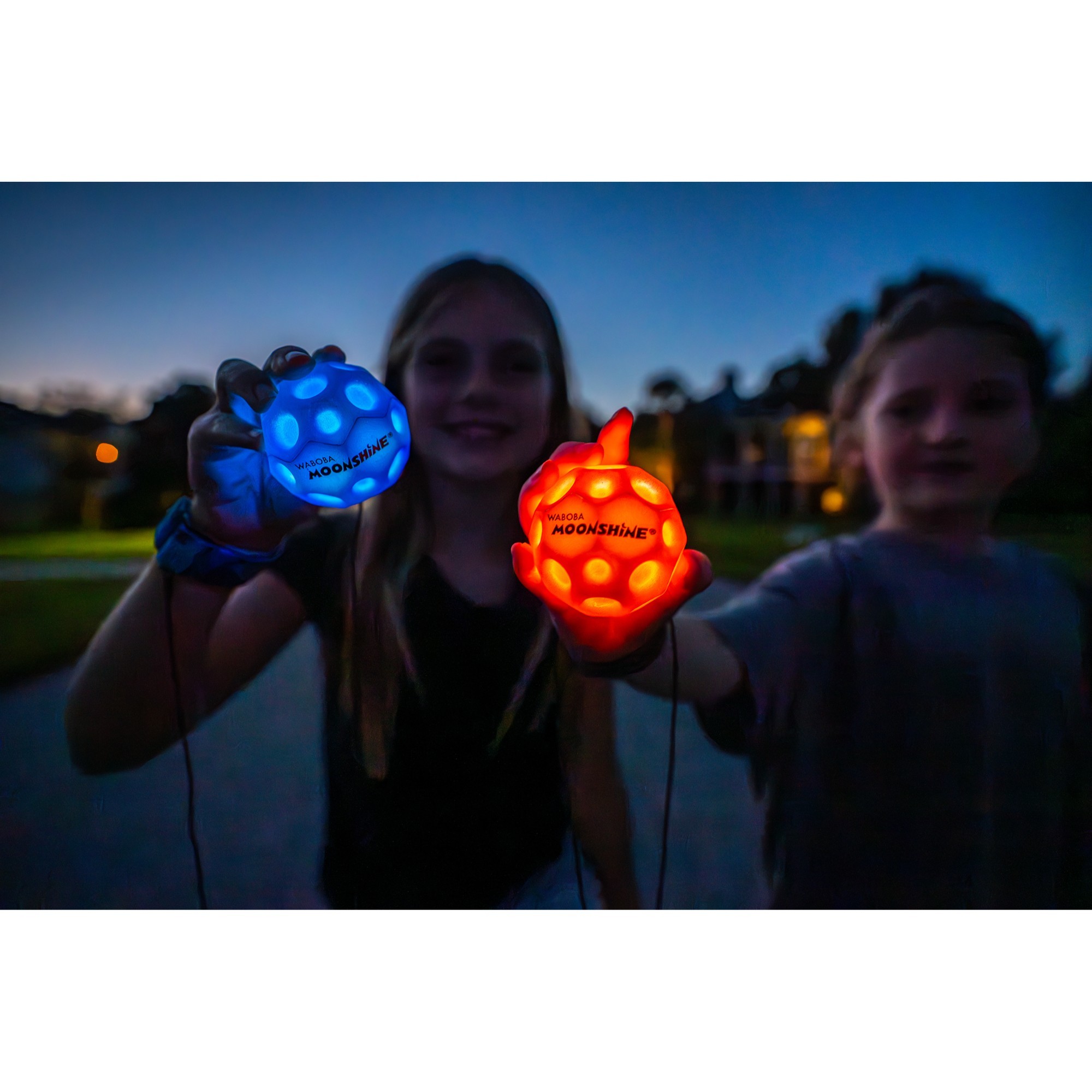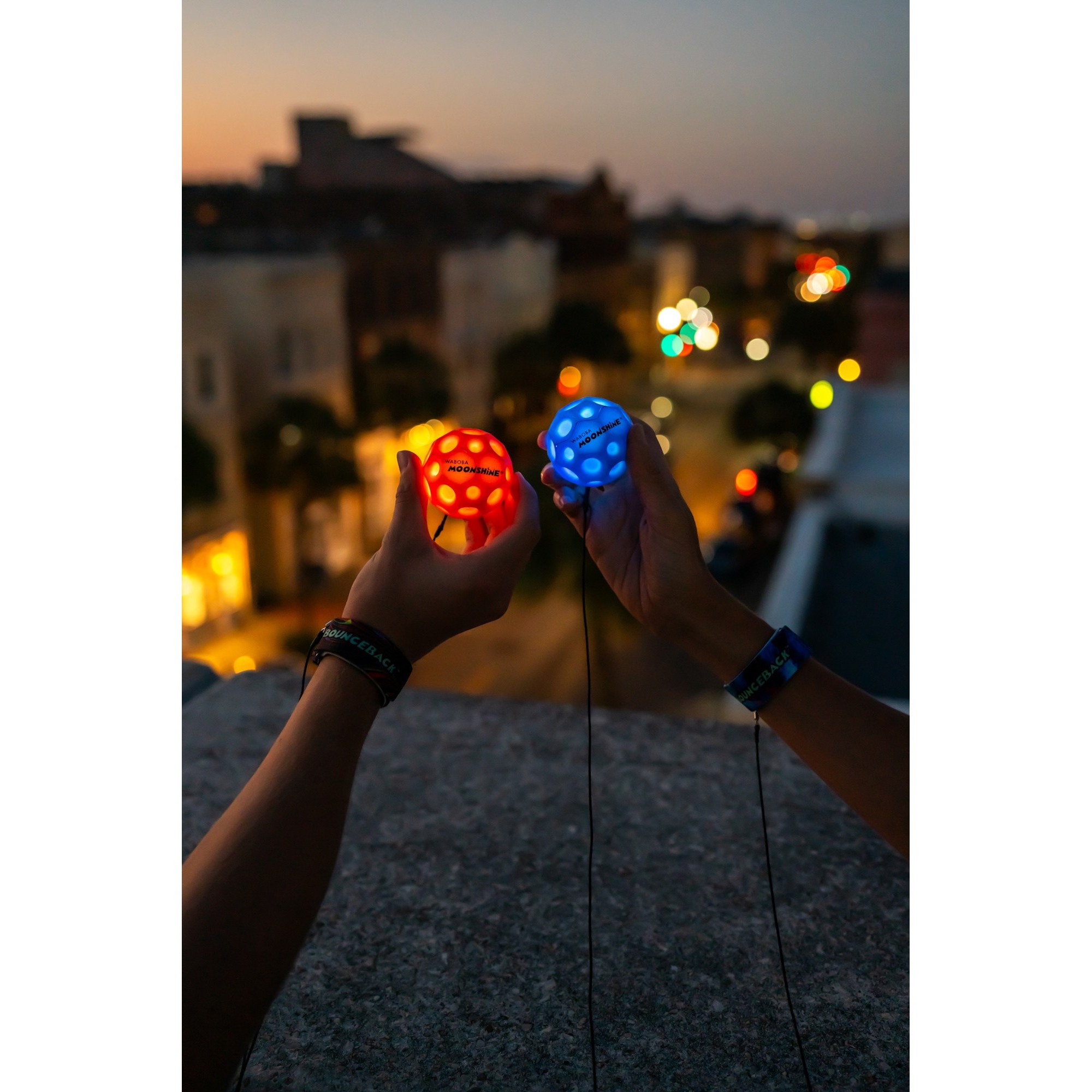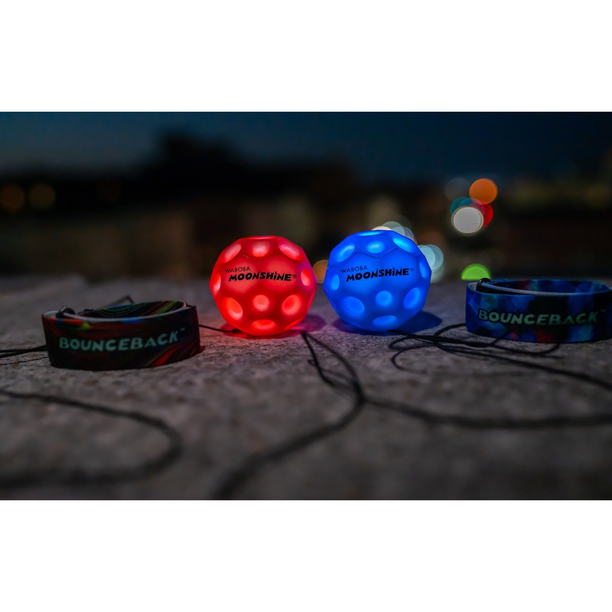 Bounceback in the dark with Moonshine! Light up nighttime play with our new nocturnal edition of a Moon Ball on a string. Get the wiggles out before bedtime!"